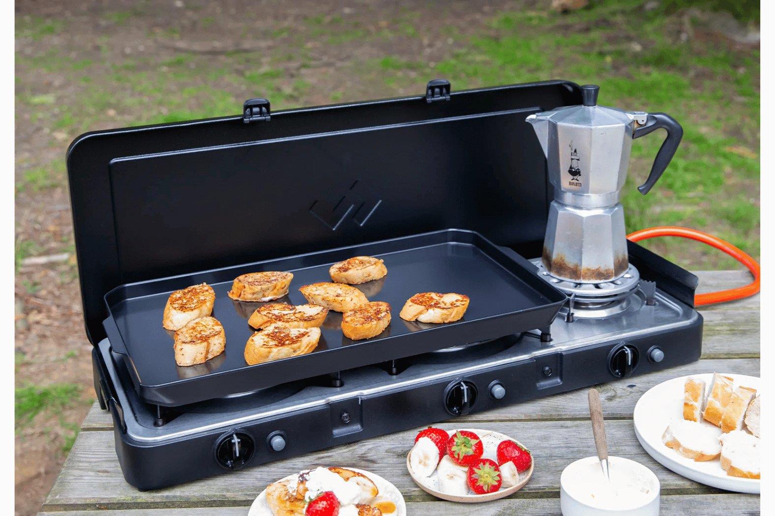 The 2 Cook Plancha is easy to take with you, thanks to the included carry bag, and is compatible with both the 2 Cook and 3 Cook range. The 2 Cook Plancha can also be used with other stove brands; just remove the feet and place the Plancha grill plate directly onto the stove’s pan holders.
