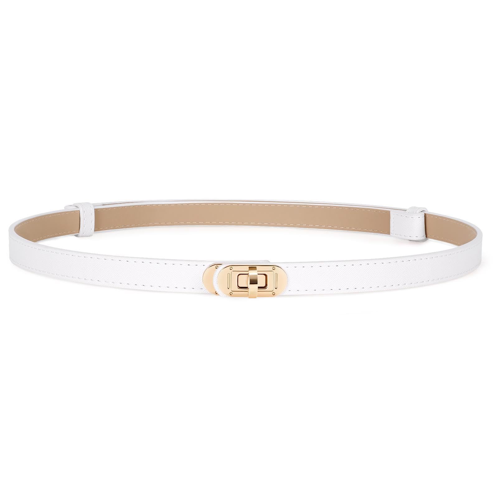 - The adjustable mechanism located at the back of the thin belt, just pull the sliding strap to your desired size. The glossy alloy turn lock is 1.42in long and 0.7in wide, easy to use. Turn the round lock to secure after adjusting the strap. This ladies thin adjustable belt is more just a fashion accessory, our skinny leather belt is a versatile and reliable companion for everyday wear, whether paired with dresses, jumpsuits, jackets, or jeans, this belt effortlessly elevates your .