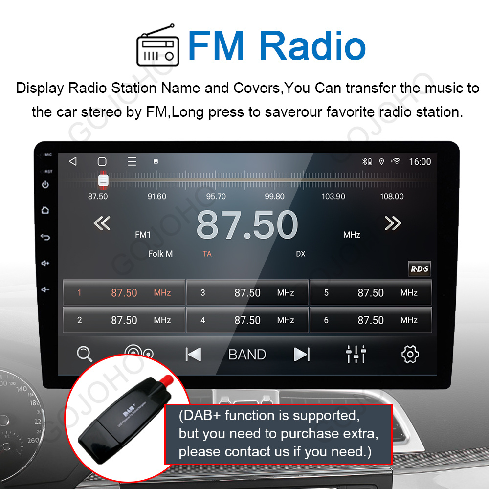 ●FM Radio: Online music you can transfer the music to the car stereo by FM to enjoy the original car stereo sound,with 18 preset stations