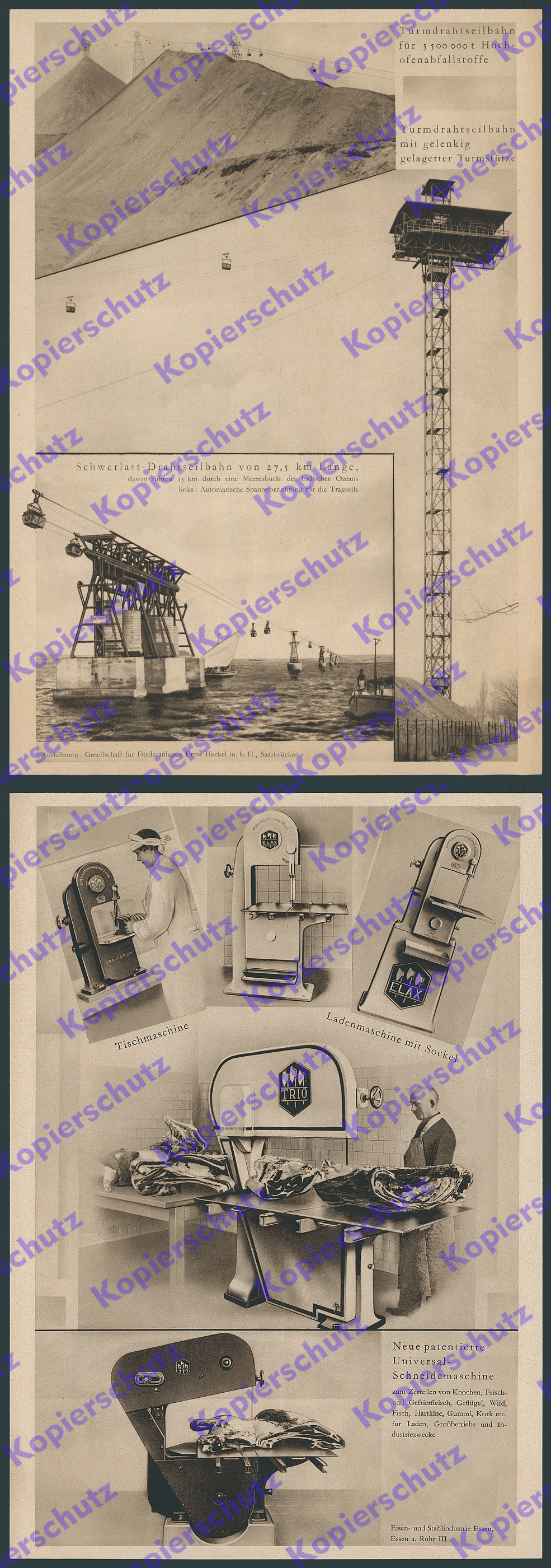 Zu Rückgabe und AGB bitte mich-Seite beachten. Die dort hinterlegten Informationen sind verbindlicher Bestandteil dieses Angebots/dieser Artikelbeschreibung!10 0 41 100, 1930, 20. Jahrhundert, 30er – Jahre, Advertisement, Advertising, Alte Berufe, Antriebsmaschinen, Antriebstechnik, Apparatebau, Arbeit, Arbeitsbahnen, Arbeitswelt, architecture, Architektur, Architekturgeschichte, Bahn, Bahnanlagen, Bahnbetrieb, Bahntechnik, Bau Steine Erden, Baugewerbe, Bauten, Bauwerk, Bauwesen, Becherwerke, Beförderung, Beladung , Bergbahnen, Bergbau, Bergwerk, Bergwerksbetrieb, Beruf, Berufe, Berufsleben, Berufswelten, Berufswesen, Betrieb, Betriebskraftmaschine, Betriebsmaschinen, Bodenschätze, Branche, Branchen, Braunkohle, Brückenbau, Brückenkrane, D-66111 Saarbrücken, D-66133, Deutsche Geschichte, Deutsche Wirtschaftsgeschichte, Deutsches Reich, Deutschland, Dienstbahn, Drahtseilbahn, Drahtseilbahnen, Drahtseile, Drahtseilschwebebahnen, Eisenkonstruktion, Eisenkonstruktionen, Energietechnik, Energiewirtschaft, Entladung, Erdarbeiten, Erdbau, Erfindungen, Fabrikate, Fabrikation, Firma, Firmen, Firmengeschichte, Firmenwerbung, Förderbahnen, Fördertechnik, Fracht, Geologie, Geschäft, Geschäfte, Gewerbe, Gondellift, Großindustrie, Gründerzeit, Gurtförderer, Güter, Güterbeförderung, Gütertransport, Güterverkehr, Hafenverladeanlagen, Handel, Handwerk, Hängebahnen mit Seilbetrieb, Hersteller, Herstellung, Historische Bilder, Hüttenwesen, Industrie, Industriebahn, Industriegeschichte, Industriezweig, Kabelkrane, Kettenbahnen, Konstruktion, Ladeanlagen, Landkreis Regionalverband Saarbrücken, Lastentransport, Lasttransport, Marke, Marken, Maschinen, Maschinenbau, Massenförderung, Mechanik, Metall, Metallbau, Metallverarbeitung, Mineralogie, Montan, Montanindustrie, Nahfördermittel, Nostalgia, Nostalgie, Ortsansichten, Ortsgeschichte, Ortskunde, Produktion, Reklame, Revier, Rohstoffe, Rohstoff-Förderung, Saarland, Schwebebahn, Schwebeseilbahn, Schwerindustrie, Schwerlastschwebebahnen, Seilbahn, Seilbahnbau, Seilschwebebahn, Spezial-Transportanlagen, Stadtgeschichte Saarbrücken, Stahl, Stahlindustrie, Standseilbahn, Steel, System Technik, Systemtechnik, Tagebau, Technik, Technikgeschichte, Topographie, Transport, Transportanlagen, Transportbahn, Transportgewerbe, Transportmittel, Transporttechnik, Transportwesen, Unternehmen, Unternehmensgeschichte, Verkehr, Verkehrsmittel, Verkehrstechnik, Verkehrswesen, Verladebrücken, Verladefördermittel, Weltfirma, Werbung, Wirtschaft, Wirtschaftsgeschichte, Wirtschaftsleben, Zeitgeschehen, Zeitgeschichte Ernst Heckel, (vollständiger Name Ernst Ferdinand Heckel, * 26. November 1861 in Saarbrücken; † 26. Mai 1949 in Tegernsee) war ein deutscher Maschinenbauingenieur und Unternehmer. Leben Sein Vater war Georg Peter Heckel (1822–1904), Drahtseilfabrikant in St. Johann (Saar), seine Mutter Elise Dorothea Heckel geb. Garelly (1833–1910). Ernst heiratete 1894 in Saarbrücken Emma (1872–1922), eine Tochter des St. Ingberter Glasfabrikanten Friedrich Johann Albert Hahne und dessen Ehefrau Bertha Hahne geb. Schmidtborn. Der bereits von seinem Urgroßvater Johann Georg Heckel († 1828) begründete Familienbetrieb galt als wegweisend in der Umstellung der konventionellen Seilfabrikation auf die Herstellung von Drahtseilen für den aufstrebenden Steinkohlenbergbau im Saarland und den Eisenerzbergbau im benachbarten Lothringen. Ernst besuchte die Gewerbeschule in Saarbrücken und studierte an der Technischen Hochschule Karlsruhe, hier trat er der Burschenschaft Germania bei (heute Teutonia). Danach erhielt Heckel eine praktische Ausbildung im Familienbetrieb, dessen Leitung er zusammen mit seinem Bruder Georg Julius (1856–1928) später übernahm. Die erfolgreiche Verwendung von Drahtseilen in der maschinellen Streckenförderung im Bergbau führte 1905 zur Errichtung der Gesellschaft für Förderanlagen Ernst Heckel, Saarbrücken. Die mit Unterstützung von Karl Glinz und anderen entwickelten Neukonstruktionen umfassten bald Transport-, Rangier- und Verladeanlagen aller Art und ermöglichten die erste Skipförderung wie auch den Bau der ersten Personendrahtseilbahn mit Großkabinen am Schauinsland bei Freiburg im Breisgau nach dem Ersten Weltkrieg. Innovativ war der Bau von Seilablaufanlagen für die Deutsche Reichsbahn in Dresden und Chemnitz. 1927 musste das Unternehmen aufgrund finanzieller Schwierigkeiten an die Felten & Guilleaume Carlswerk AG, Köln, und damit an den Arbed-Konzern verkauft werden. 1912 gründete Heckel in Saarbrücken einen Orchesterverein, 1913 einen Theaterverein. Ehrungen 1917: Ernennung zum Kommerzienrat 1918: Ehrendoktorwürde der Technischen Hochschule Karlsruhe (als Dr.-Ing. E.h.) Im St. Ingberter Stadtteil Rohrbach wurde die Ernst-Heckel-Straße nach ihm benannt. Die Gesellschaft für Förderanlagen Ernst Heckel war ein 1905 in Saarbrücken von Ernst Heckel gegründetes Unternehmen. Geschichte Ernst Heckel hatte mit seinem Bruder Georg Julius (1856–1928) die väterliche Drahtseilfabrik fortgeführt und ihre Produkte erfolgreich in die maschinelle Streckenförderung der saarländischen und Lothringer Bergwerke eingeführt. In der neuen Firma erweiterte Ernst Heckel das Tätigkeitsfeld auf die verschiedensten Transport- und Förderanlagen. Die mit Unterstützung von Karl Glinz und anderen entwickelten Neukonstruktionen umfassten bald Transport-, Rangier- und Verladeanlagen aller Art. Das Unternehmen produzierte Materialseilbahnen, Standseilbahnen, Seil- und Kettenförderungen, Transportbandanlagen, große Speicher- und Verladeanlagen, Rangieranlagen usw. Es entwickelte und produzierte die erste Skipförderung. Für die Deutsche Reichsbahn wurden innovative Seilablaufanlagen in Dresden und Chemnitz errichtet. 1927 musste das Unternehmen aufgrund finanzieller Schwierigkeiten an die Felten & Guilleaume Carlswerk AG, Köln-Mülheim, verkauft werden, dem damals größten Drahtseilhersteller Europas, die ihrerseits zu 