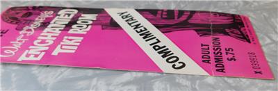 ~ Ticket is on heavy, glossy card stock in a deep fuschia color with tiki totem artwork and lettering in both black and white. It measures 7½"x2¾"