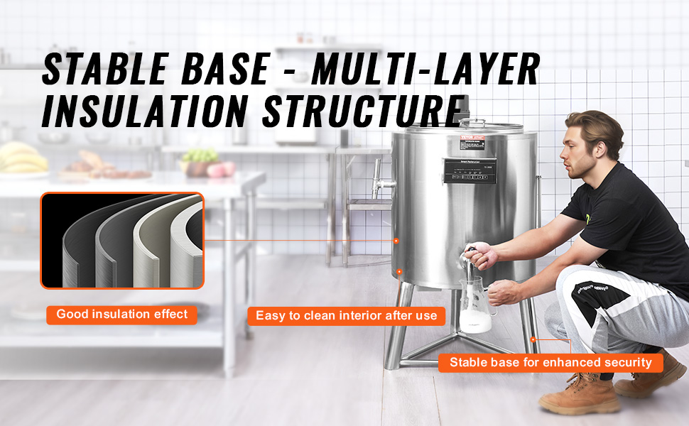 Reliable Stainless Steel Material: The inner tank is crafted from food-grade 304 stainless steel, with a seamless, durable, and corrosion-resistant design. Easy to clean and meeting food security standards, ensuring product purity. The milk pasteurizer machine operates smoothly, minimizing vibration to increase safety.