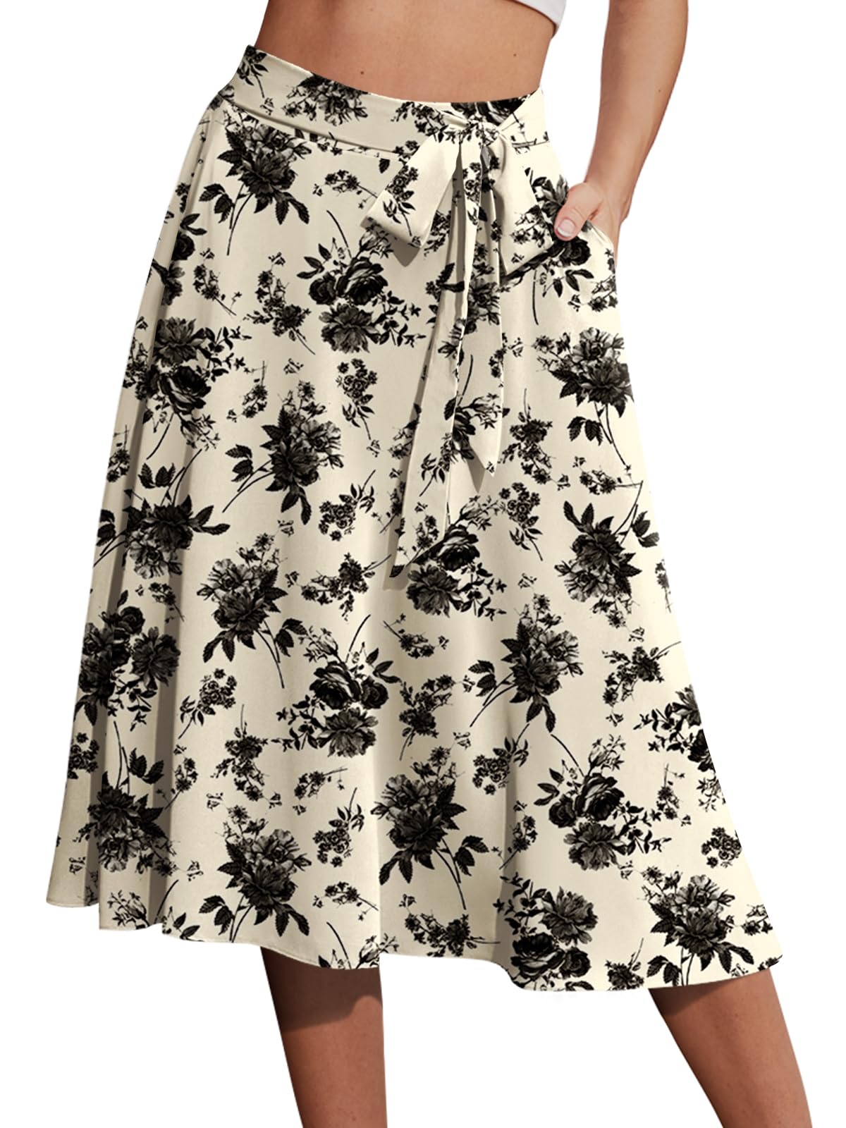 Women's A-Line Midi Skirt with Pockets High Waist Flared Below The Knee Skirts (Black Flower Light Beige, L)