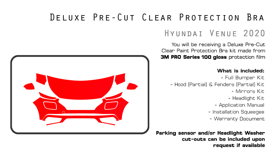 Q: Which areas of my car will be protected? A: Our Deluxe Kit will include pieces for the bumper, hood (partial size), fenders (partial size), headlights, and mirrors.