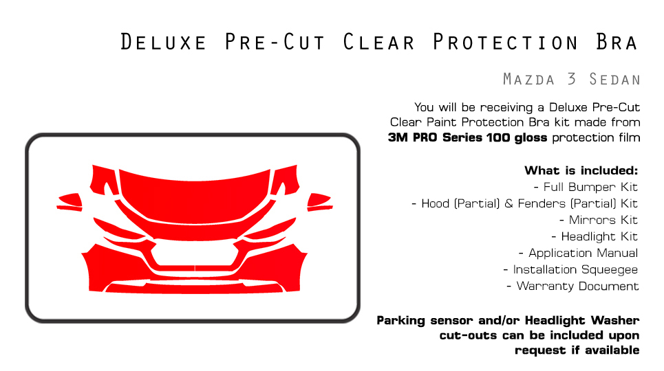 Q: Which areas of my car will be protected? A: Our Deluxe Kit will include pieces for the bumper, hood (partial size), fenders (partial size), headlights, and mirrors.