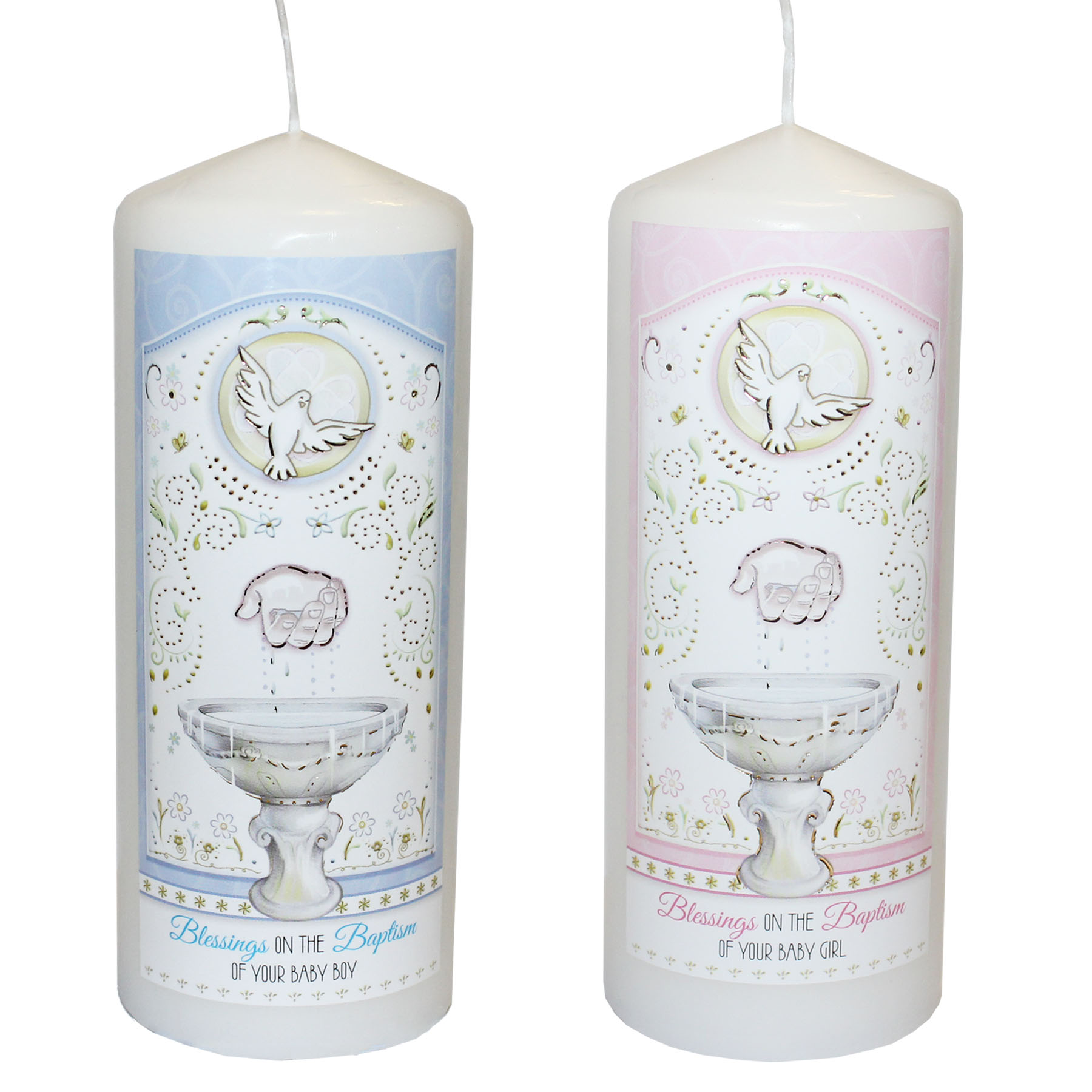 - Mediendo 14 cm x 6 cm, esta vela de pilar es el tamaño ideal para exhibir en una repisa de chimenea o como una pieza central durante la ceremonia de bautismo.
