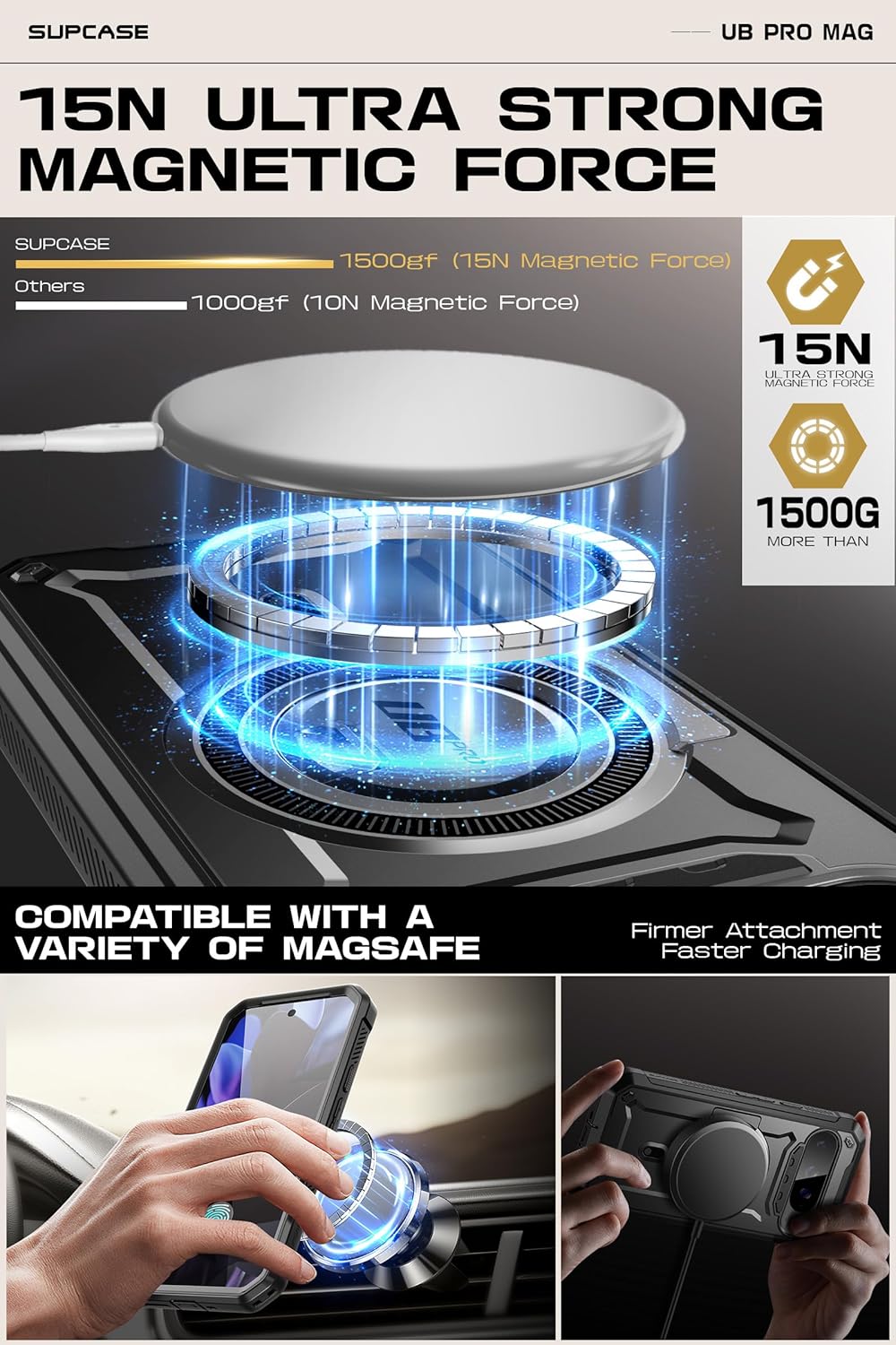 Seamless compatibility with a wide array of MagSafe accessories (magnetic car mount, MagSafe wireless charger, magnetic card holder, desktop magnetic wireless charging stand).Equipped with an N52 powerful magnet, offering a magnetic force of up to 1500g, significantly exceeding the industry average range of 700g-1200g.