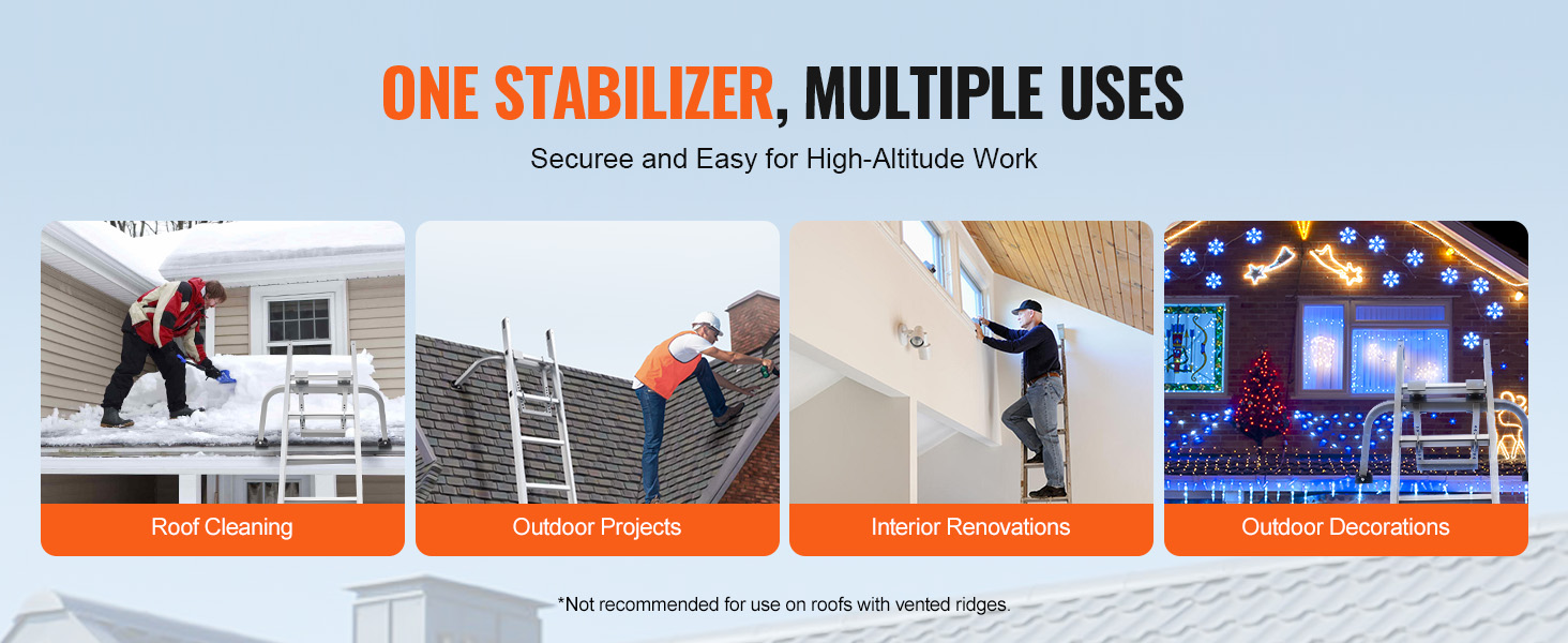 Designed for multiple applications, our ladder stabilizer makes high-altitude work easy and safe. Ideal for roof cleaning, outdoor tasks, indoor renovations, and exterior decorations. Note: Not recommended for roofs with ventilated ridges.