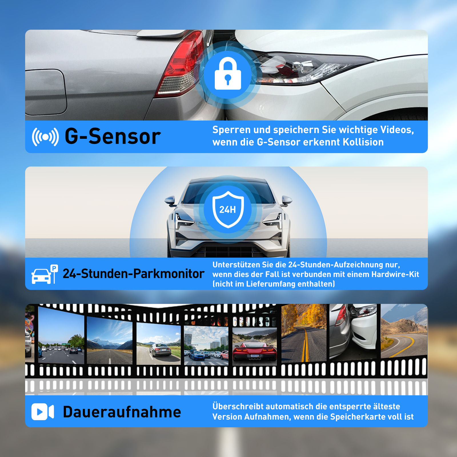 24-Stunden-Parküberwachung (kabelgebundenes Kit erforderlich, nicht im Lieferumfang enthalten) - Auch wenn Sie nicht in der Nähe des Fahrzeugs sind, kann die Dashcam die Situation rund um das Fahrzeug weiter überwachen. Bei einer Kollision oder einem ungewöhnlichen Ereignis werden die entsprechenden Aufnahmen automatisch aufgezeichnet und gespeichert, sodass Sie wichtige Beweise für die Sicherheit des Fahrzeugs erhalten.