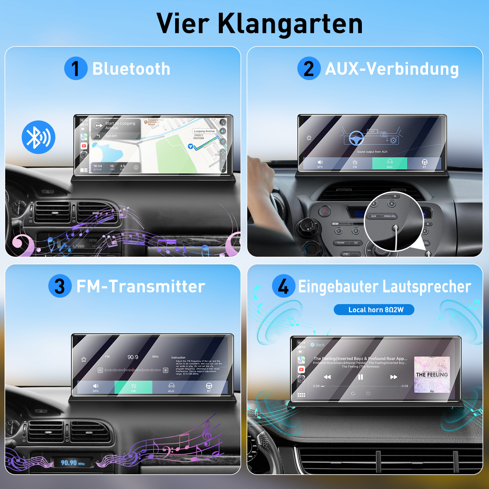 Bluetooth: Mit der Bluetooth-Verbindung können Sie Ihr mobiles Gerät drahtlos mit dem Autoradio verbinden, um den Ton zu synchronisieren.