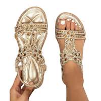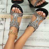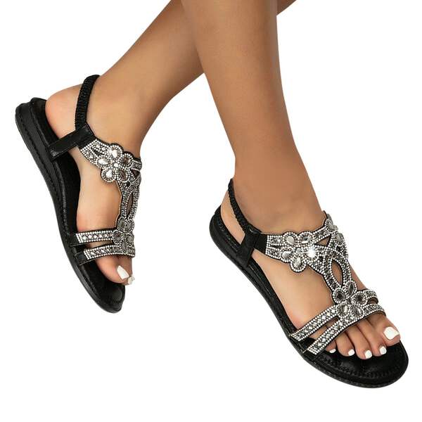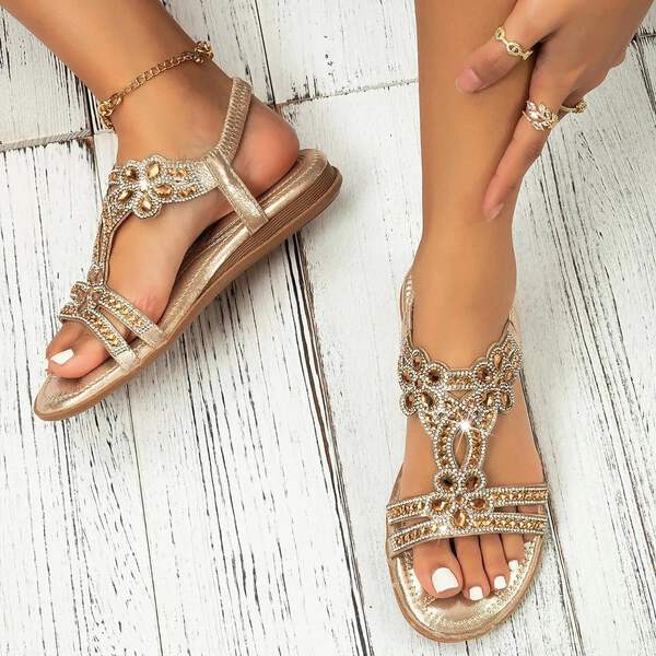 Stylish Bohemian Design: Features rhinestone floral accents with a classic T-strap look for a chic beach-ready vibe.