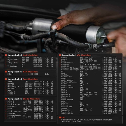 | VW | Beetle | 5C1, 5C2, 5C7, 5C8 | 2011/04-2019/07 | 1.2L-2.0L | Benzin |
