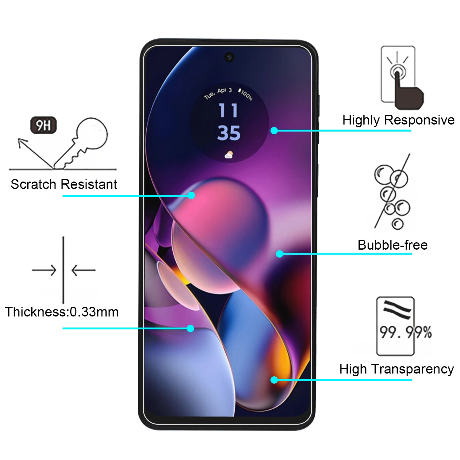 SUPREME CLARITY - 99.99% HD Clarity and Maintains the Original Touch Experience 0.3mm 9H Hardness Anti-Scratch, Anti-Fingerprint, Bubble Free Hydrophobic and Oleo-phobic coatings protect against sweat and oil residue from fingerprint