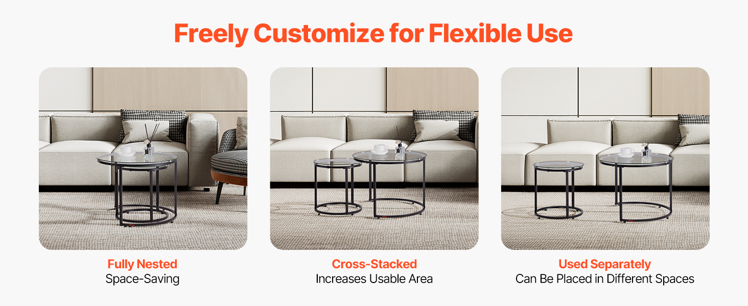 Stable and Durable: Our round nesting coffee table has a sturdy carbon steel frame, which can withstand everyday pressures and maintain its integrity over time. The adjustable foot pads let you quickly deal with uneven floors, ensuring the table stays stable and wobble-free