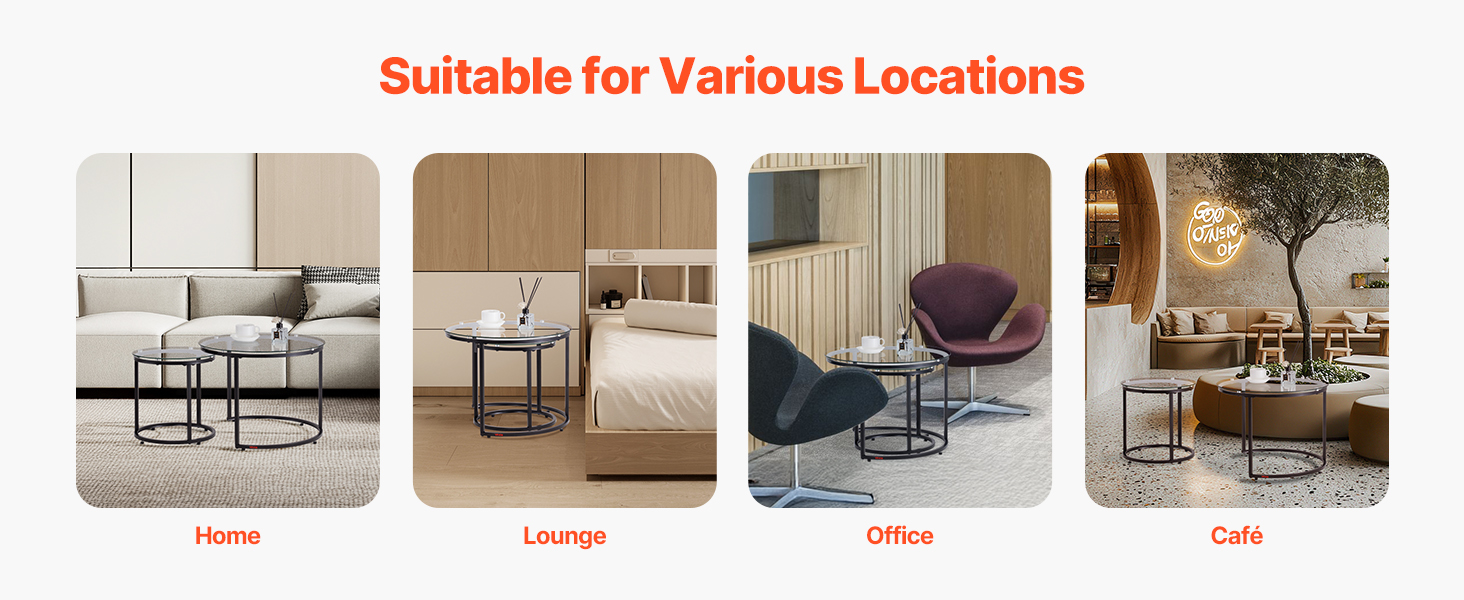 The nesting coffee table is designed to be flexible and suitable for various places to meet your diverse needs, such as living rooms, bedrooms, lounges, offices, and cafes.