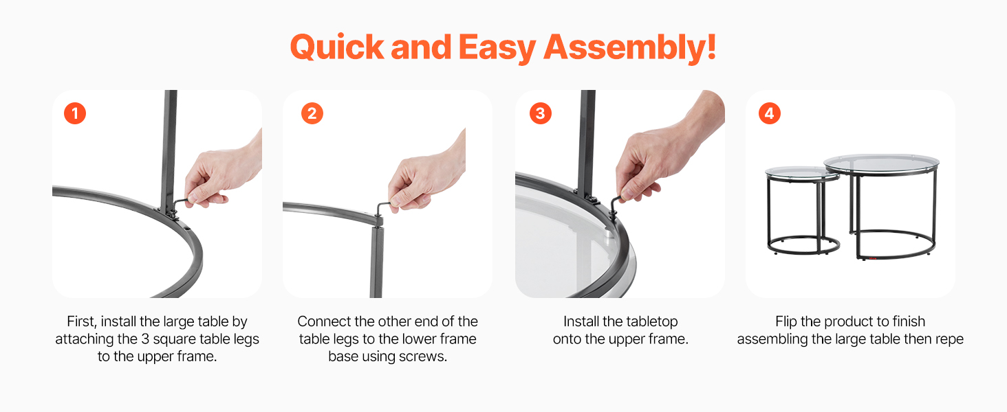 Assembly of this round nesting table is simple with the detailed instructions provided. Just follow the steps to connect and fix the parts, allowing you to set up the table quickly and save valuable time.