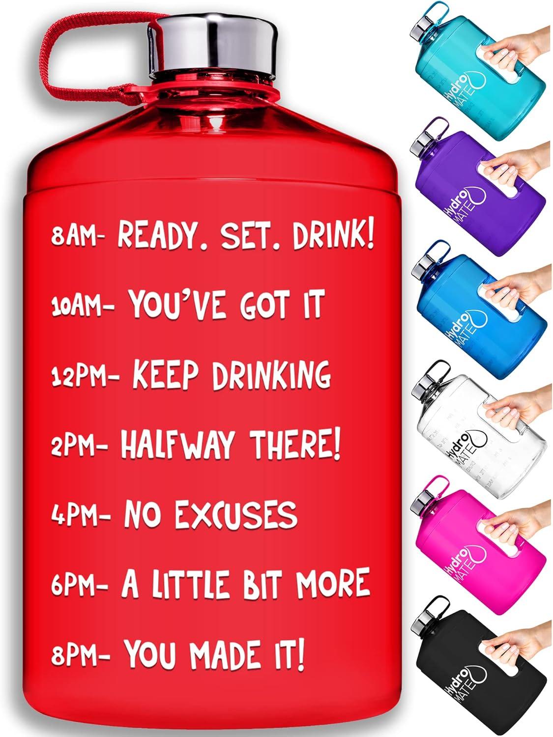 HydroMATE Motivational Water Bottle with Time Marker. Now its easier than ever to drink more water with Hydro MATE inspirational water bottle with time markings. Fun motivational quotes keep you inspired to reach you health and hydration goals. All of Hydro MATE bottles are Non-Toxic and BPA-FREE. Our leak proof water bottles are made from extra durable eco-friendly plastic. Reusable water bottles are better for the environment, and our water bottle handle makes it easier to take your water with you on the go. HydroMATE water bottle with straw is the perfect travel companion. Our water bottle strap is made of extra durable nylon. This Half Gallon Water Jug with Time Markings holds a large 64oz capacity and comes in pink, purple, blue, green, red, black, and clear. Makes the perfect gift for mom, gift for dad, fitness gift, healthy gift, gift for wife, gift for husband, christmas gift, birthday gift, gift for kids, gift for her, gift for him, mothers day gift, fathers day gift, or xmas gift. Half Gallon (64oz) Motivational Water Bottle with Time Marker. Hydro MATE BPA Free Motivational Water Bottle with Handle. Hydro MATE Reusable Leak Proof Water Bottle. Large Water Jug with Time Markings. Drink More Water Bottle with Strap. No chemical tastes or odors. Get inspired to drink more water! Prefect gift for any fitness enthusiast.