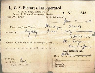 L.V.N. Pictures, Incorporated, Receipt to a Mr. Mendoza in payment of company share dated Jan 2, 1950 (other paper & ephemera that came with these were dated from the 1950s-1960s.