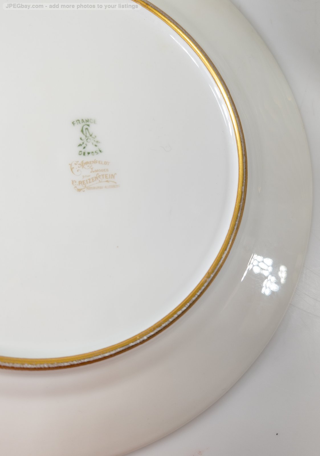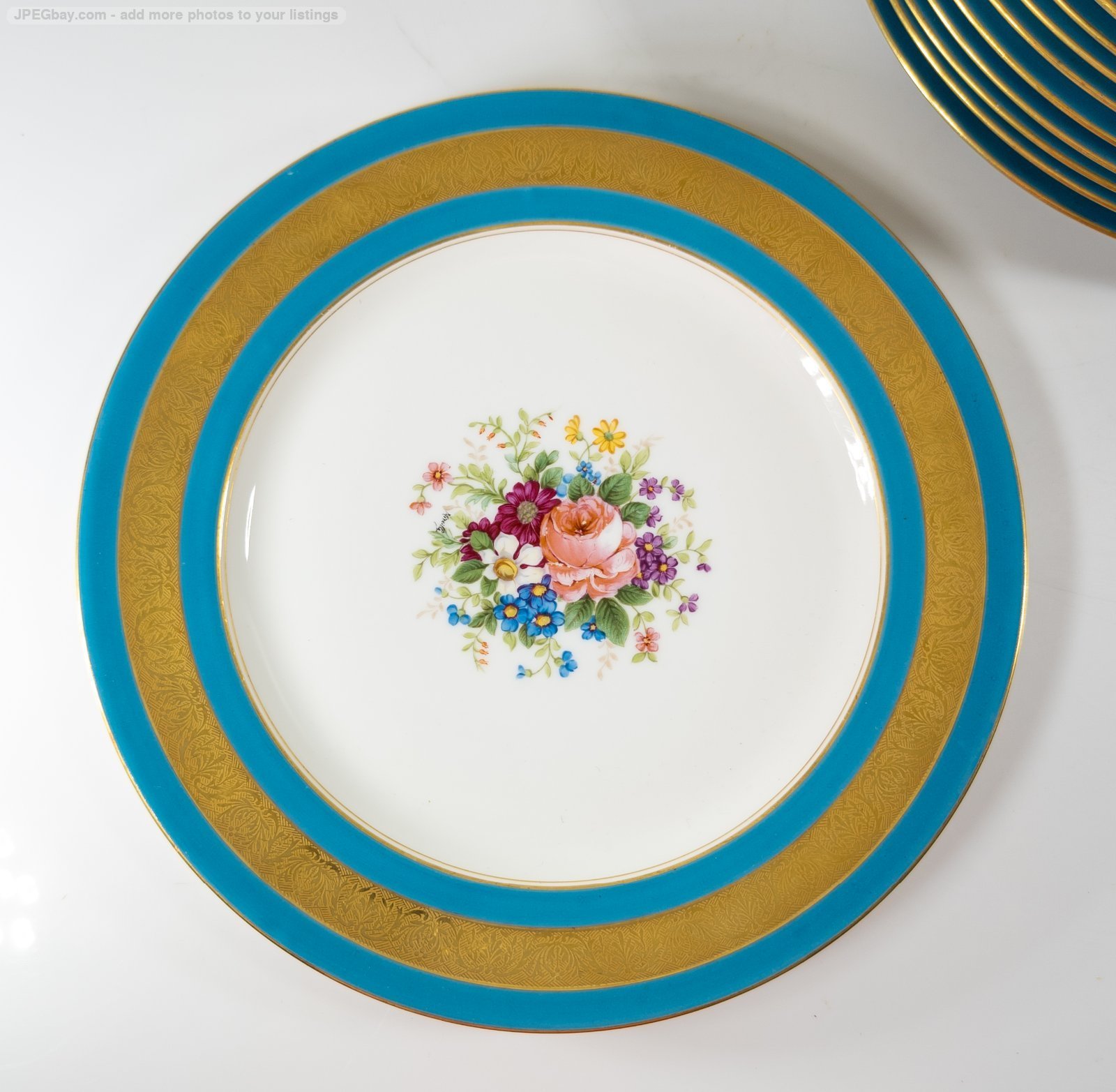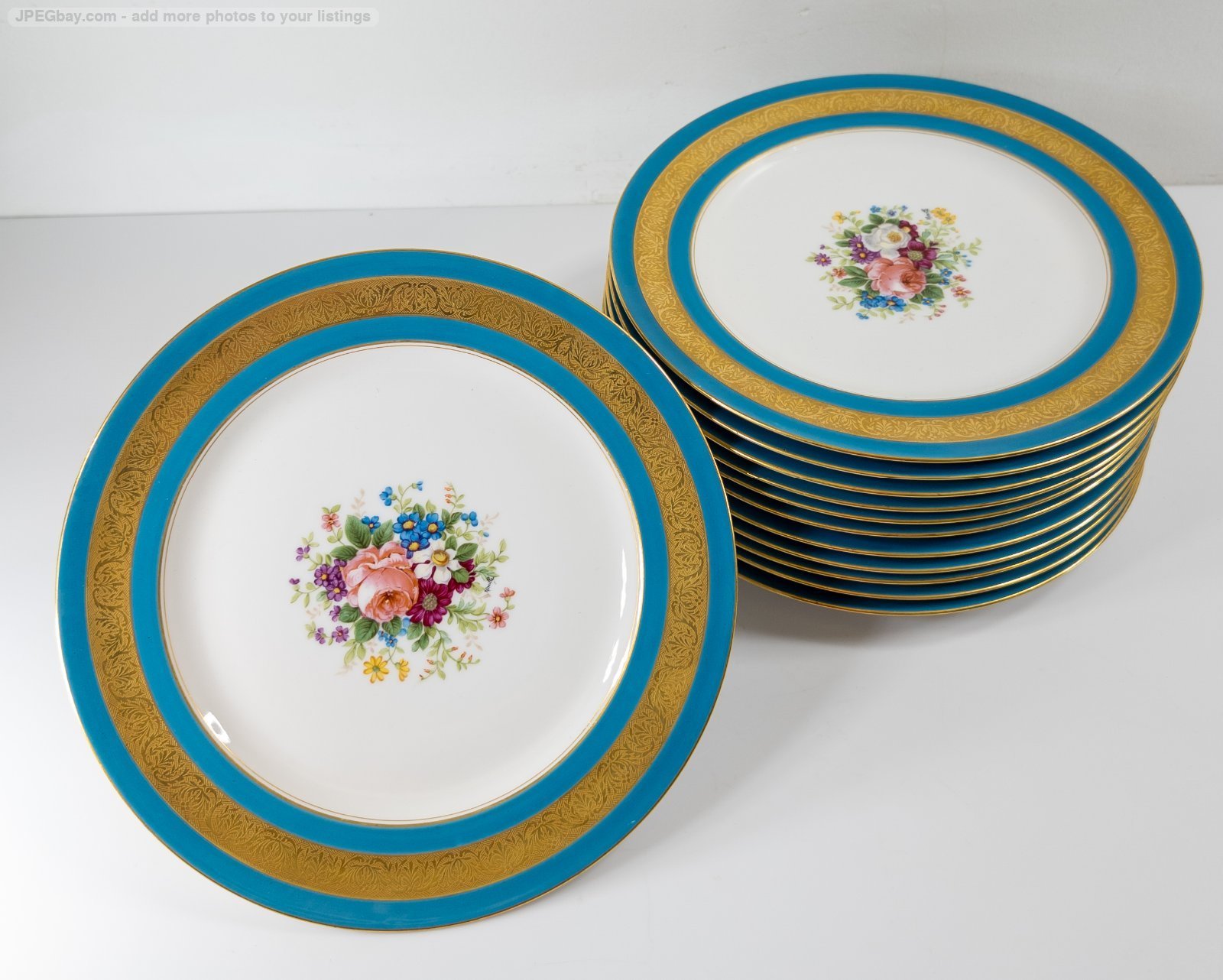 We are selling this gorgeous set of French Limoges porcelain plates. This set of twelve plates are 10 3/8 Inches in diameter. The plates have bright turquoise teal bleu celeste type color with gold encrusted band and central floral motif. The plates. The plates are marked France Depose Ahrenfeldt Limoges for Reizenstein Pittsburgh Allegheny