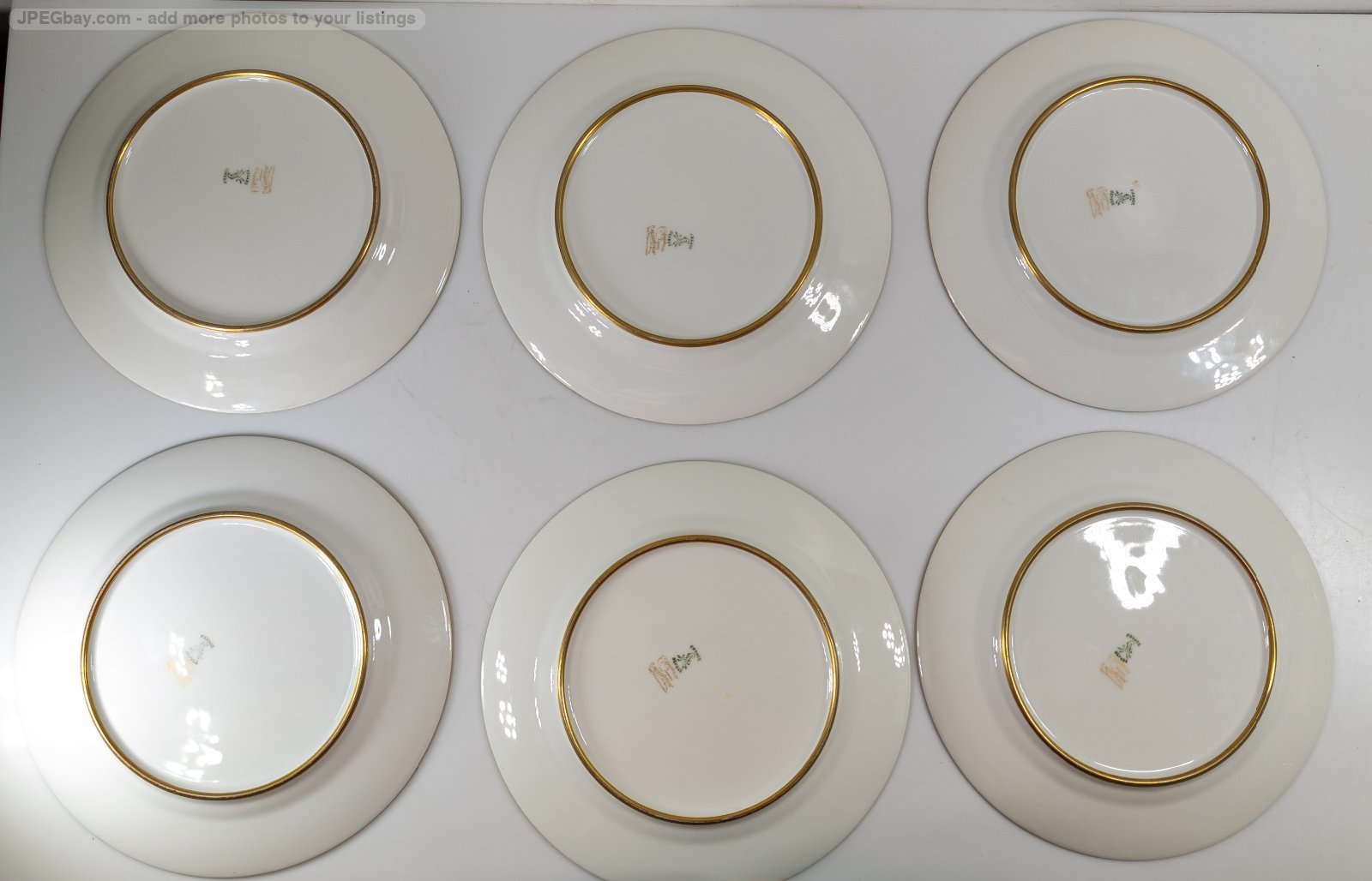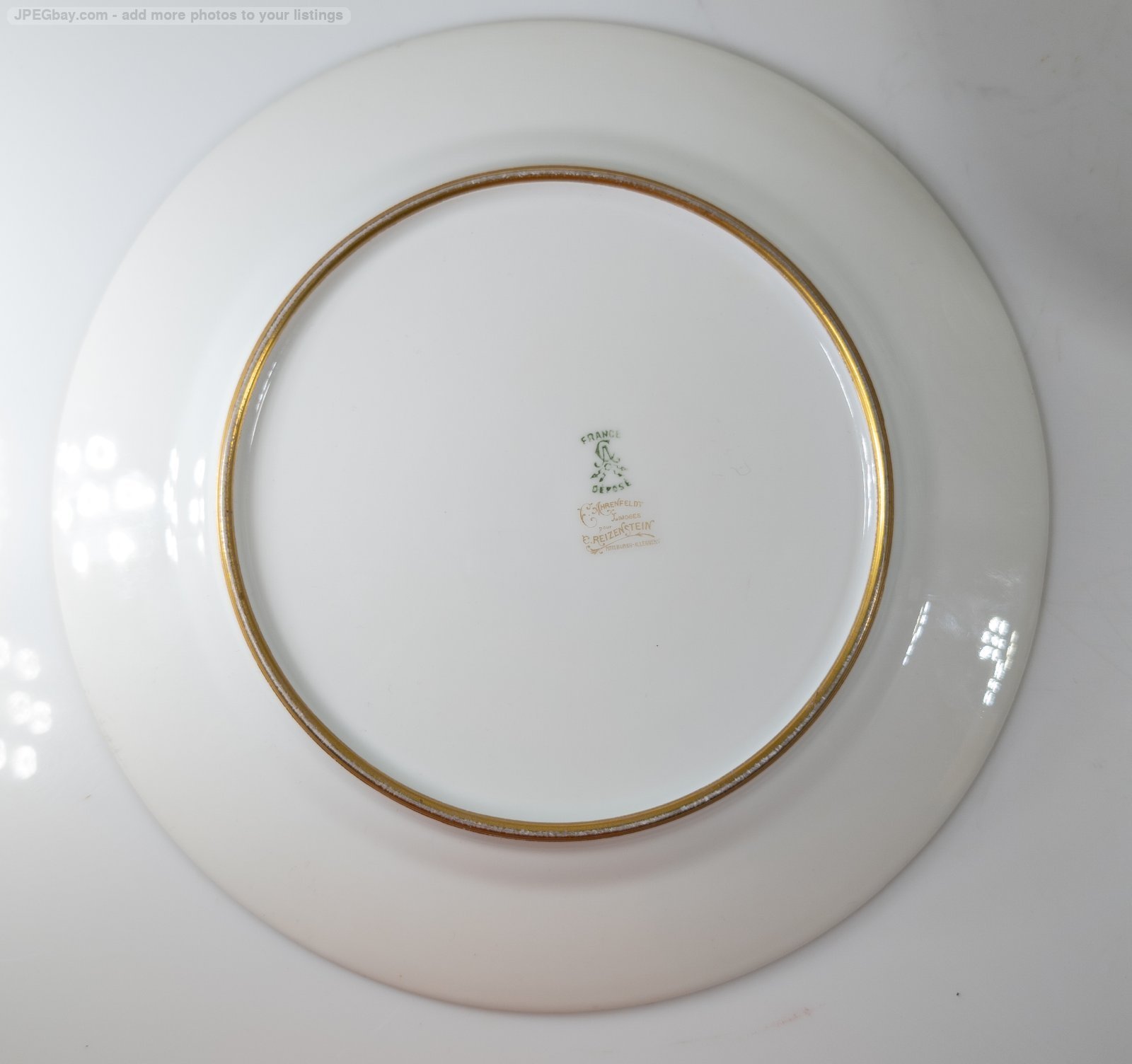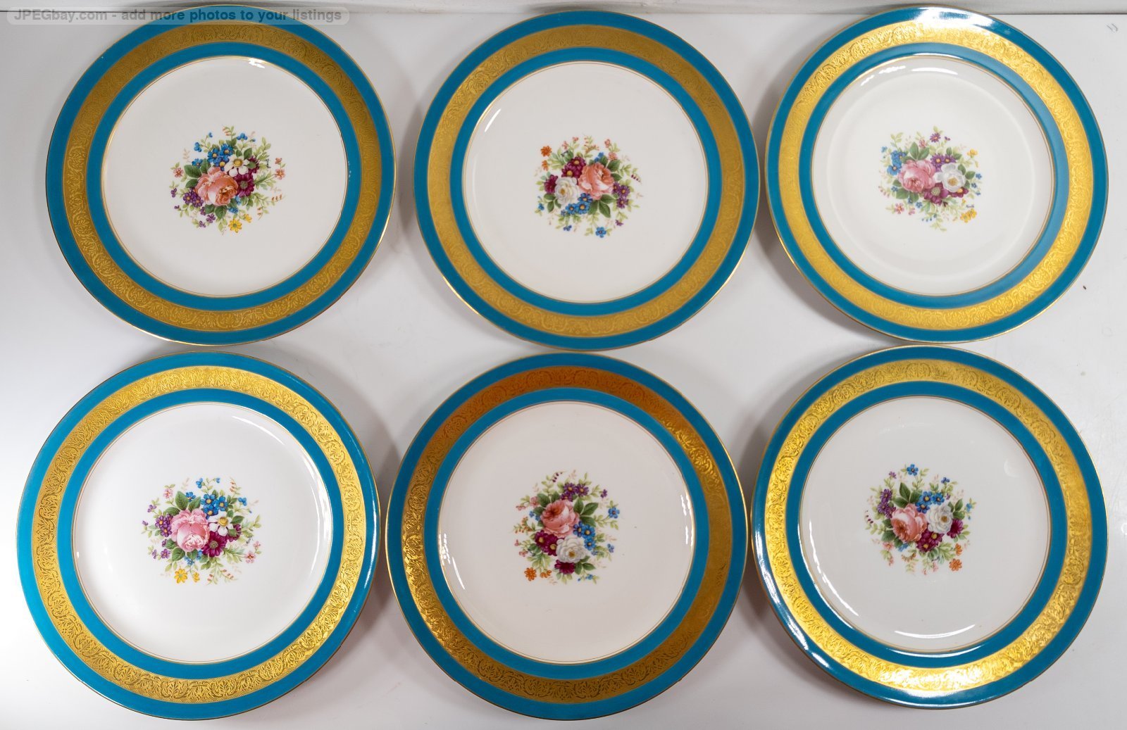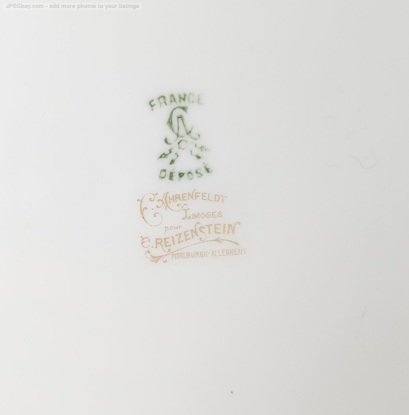 We are selling this gorgeous set of French Limoges porcelain plates. This set of twelve plates are 10 3/8 Inches in diameter. The plates have bright turquoise teal bleu celeste type color with gold encrusted band and central floral motif. The plates. The plates are marked France Depose Ahrenfeldt Limoges for Reizenstein Pittsburgh Allegheny