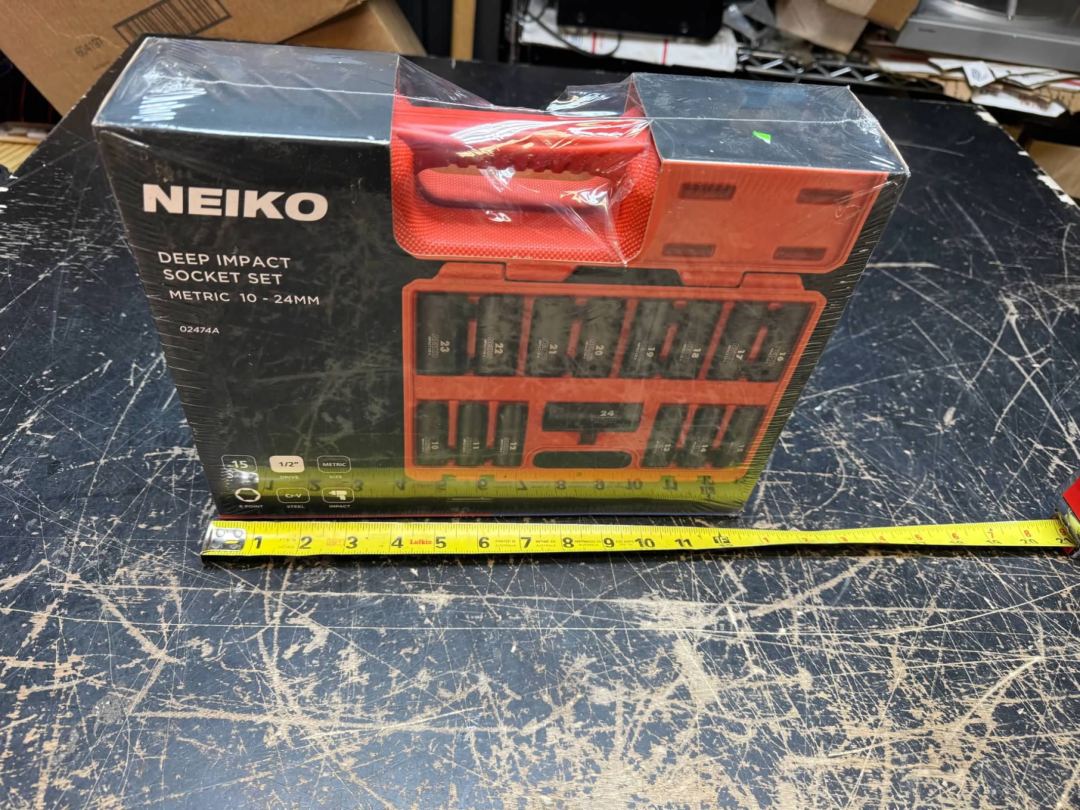 Neiko 02474A Deep Impact Socket Set 1/2" Drive 10-24mm Metric. New in the shrink wrap packaging. Shrink wrap shows some rips and tear spots from previous handling and storage.