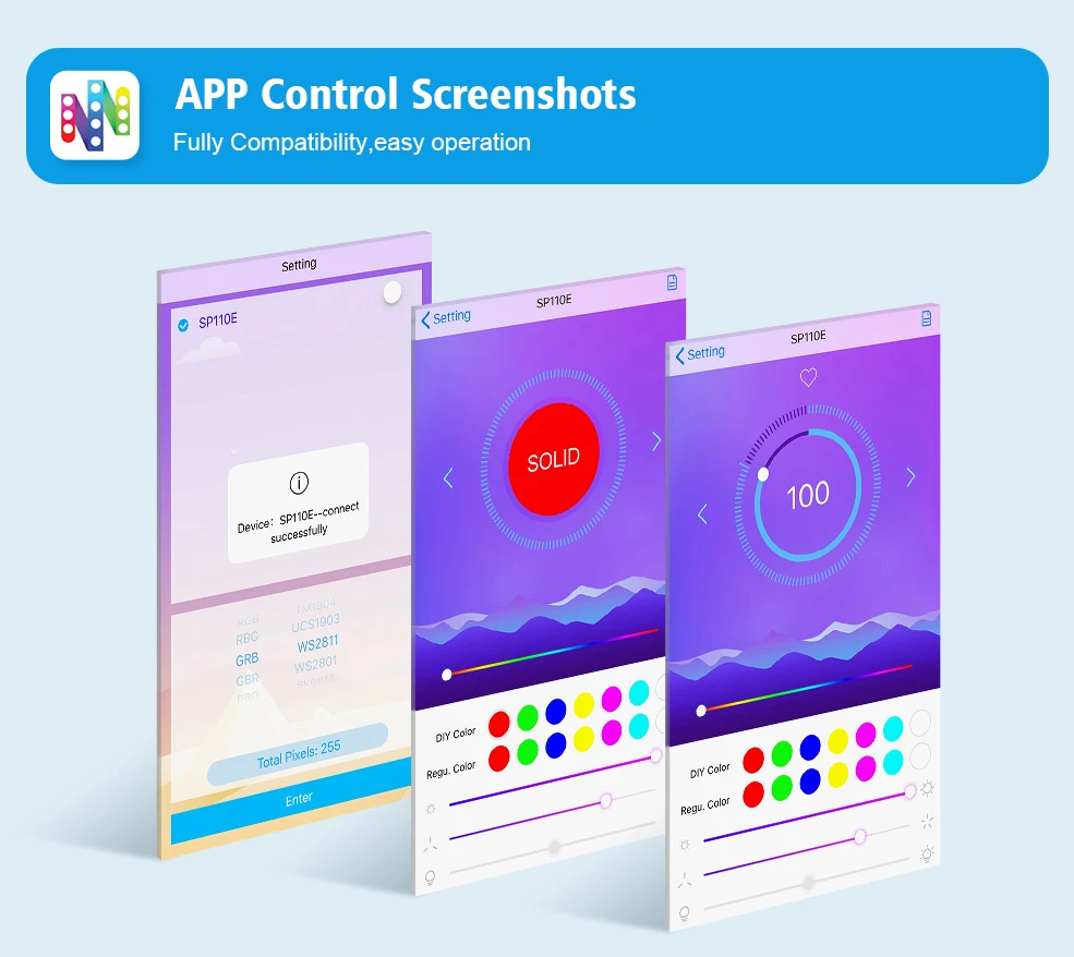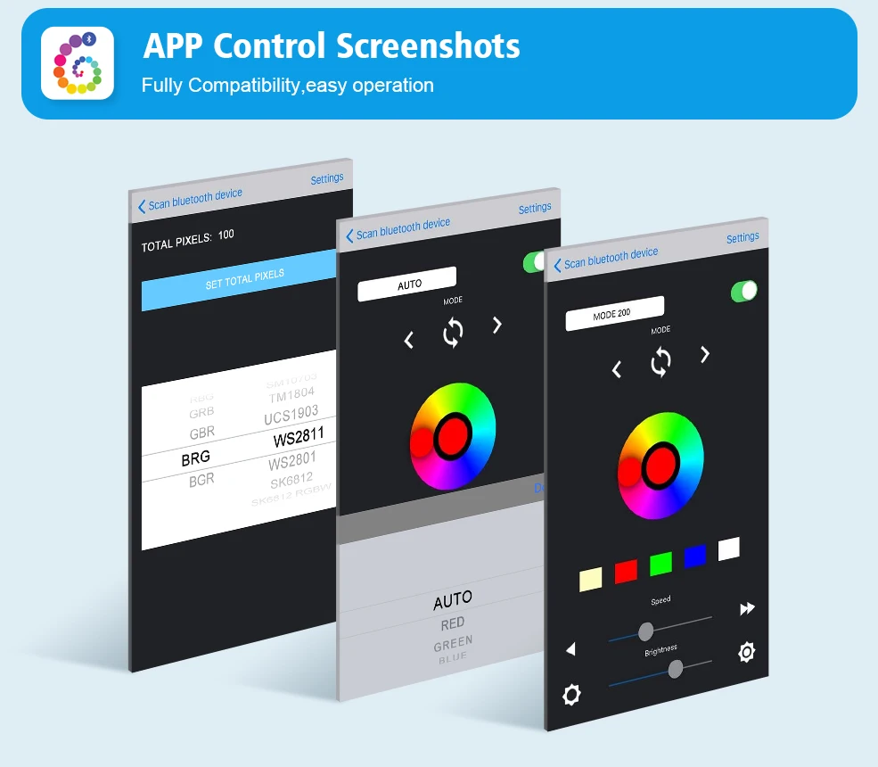 Compatibale IC type: WS2812B,WS2811,SK6812, SK6812-RGBW,SM16703, WS2813, WS2815, CS8812, AL2815, WS2801, APA102, SK9822,UCS1903, LPD6803, LPD8806, APA102