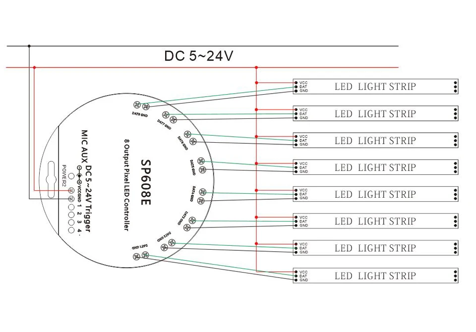 microphone / AUX IN Magical colour effect mode: 9+40Output port: 8 (Standalone 8 ways, Can independently control the color of each way.) Connector: 3Pin