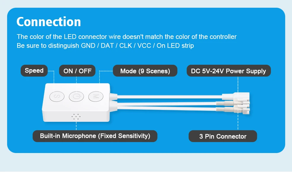 connector Input Voltage: DC5-24V Maximum current: 5.7A Pixel: 600 Music activated mode: Built-in microphone /