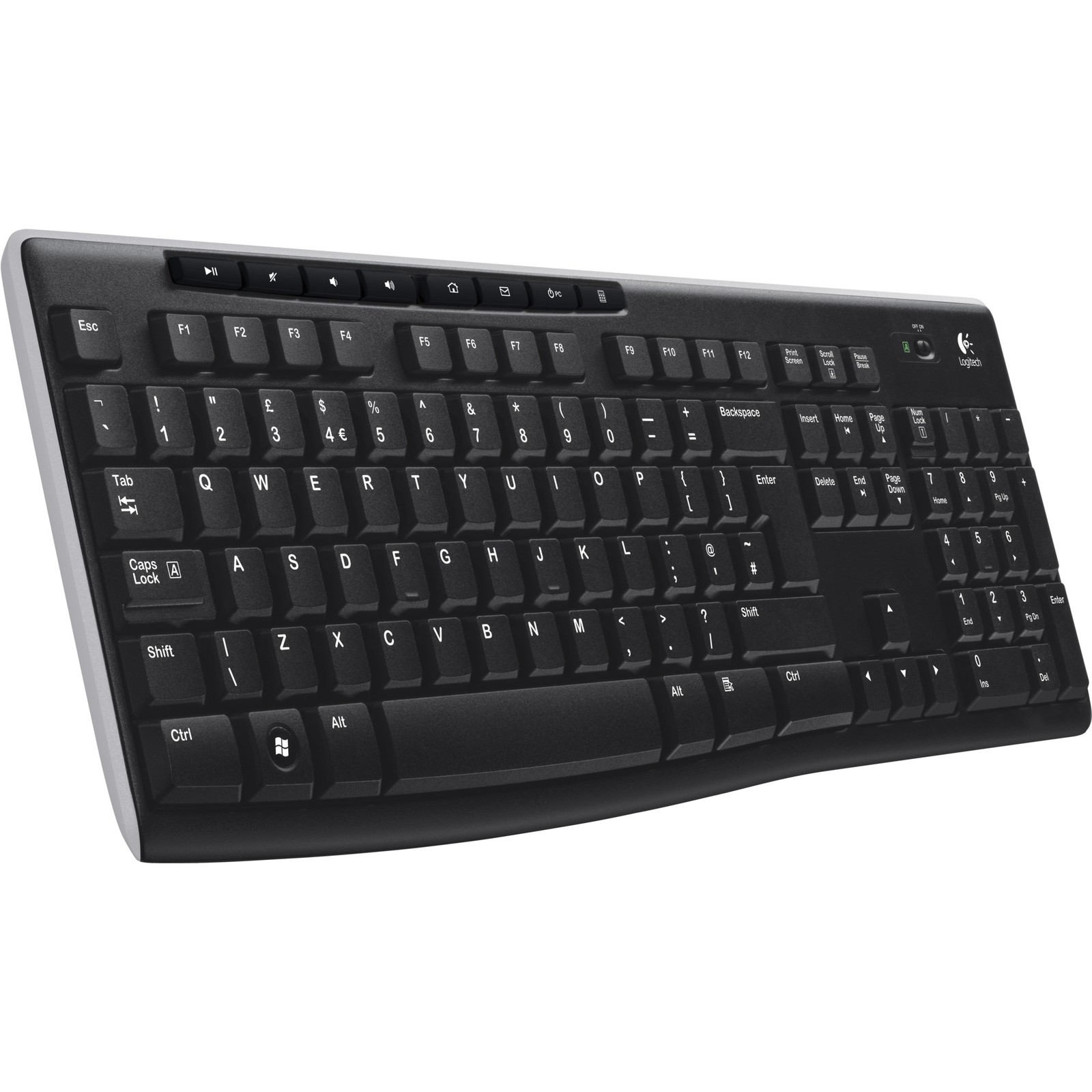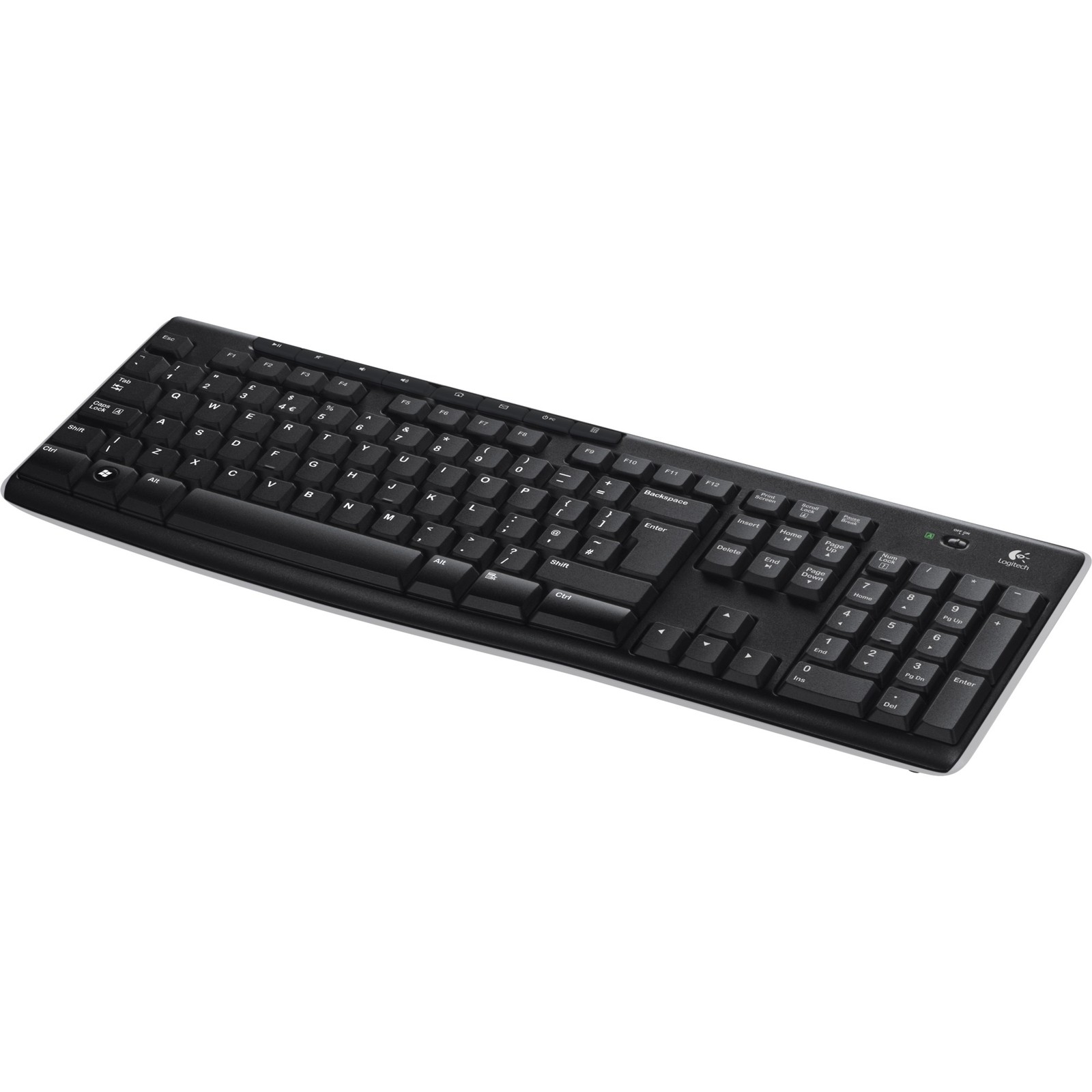 Das Logitech Wireless Keyboard K270 wird mit einem winzigen Unifying-Empfänger geliefert, der ständig in einem Notebook eingesteckt bleiben kann ohne beschädigt zu werden, selbst wenn man es transportiert. Und über denselben Empfänger kann man weitere Geräte hinzufügen. Das elegante Wireless Keyboard K270 spart Platz, ohne Zugeständnisse beim Komfort zu machen - mit vertraut angeordneten Tasten in Standardgröße inklusive Nummernblock und einer breiten und leicht gewölbten Leertaste. Über acht Sondertasten hat man sofortigen Zugriff auf Musik, E-Mail-Programm und vieles mehr. Aufgrund der speziellen Beschichtung verblassen die Tasten nicht, sodass man auch nach Jahren sieht, was man tippt. Dank der intelligenten Energieverwaltung halten die Batterien jahrelang. Die Einrichtung ist eine Frage von Sekunden: einfach den kabellosen Empfänger in einen USB-Anschluss des Computers einstecken und schon ist die Tastatur einsatzbereit - ganz ohne Software. Dank des Spritzwasserschutzes können Flüssigkeiten vom Wireless Keyboard K270 ablaufen - bei versehentlichem Verschütten besteht daher kein Grund zur Sorge.