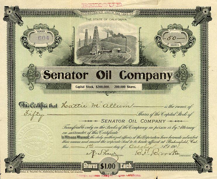 1901 Senator Oil Stock Certificate. Attractive early California oil scripophily certificate with vignette of several oil rigs. Company likely one of many early drillers in the Kern River Oil Field north of Bakersfield California. Bakersfield became a boom town after discovery of oil here in 1899. VF condition.