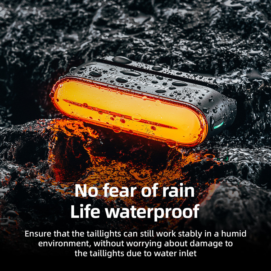 Product Features 1.Brake I Light sense Vibration sensing Windbreaker Magnetic Smart Tail Light 2.Dormant while resting Light sense self-starting 3.No fear of rain Life waterproof 4.Magnetic installation Stable and reliable 5.Smart light sense Windbreaker magnetic tail light 6.7 Lighting Modes / Brake Sensing / Day & Night Light Sensing / Smart Start & Stop When the brake is sensed Highlight lasts for 1.5s Normal riding Regular mode Intelligent brake sensing When the speed is detected to be significantly reduced, thelights will immediately switch to the highlighted stateand remain for about 1.5s to warn the rear vehicle Dormant while restingLight sense self-starting In automatic modeWhen the ambient light is sufficient(Such as in the scorching sum)or when the bike is parked andstationary for 2minutes,thetaillights automatically sleep In automatic modeAutomatically wake up the taillightswhen the ambient light is insufficient(Such as in a tumnel)or when vibrationis detected,and guickly hit the road