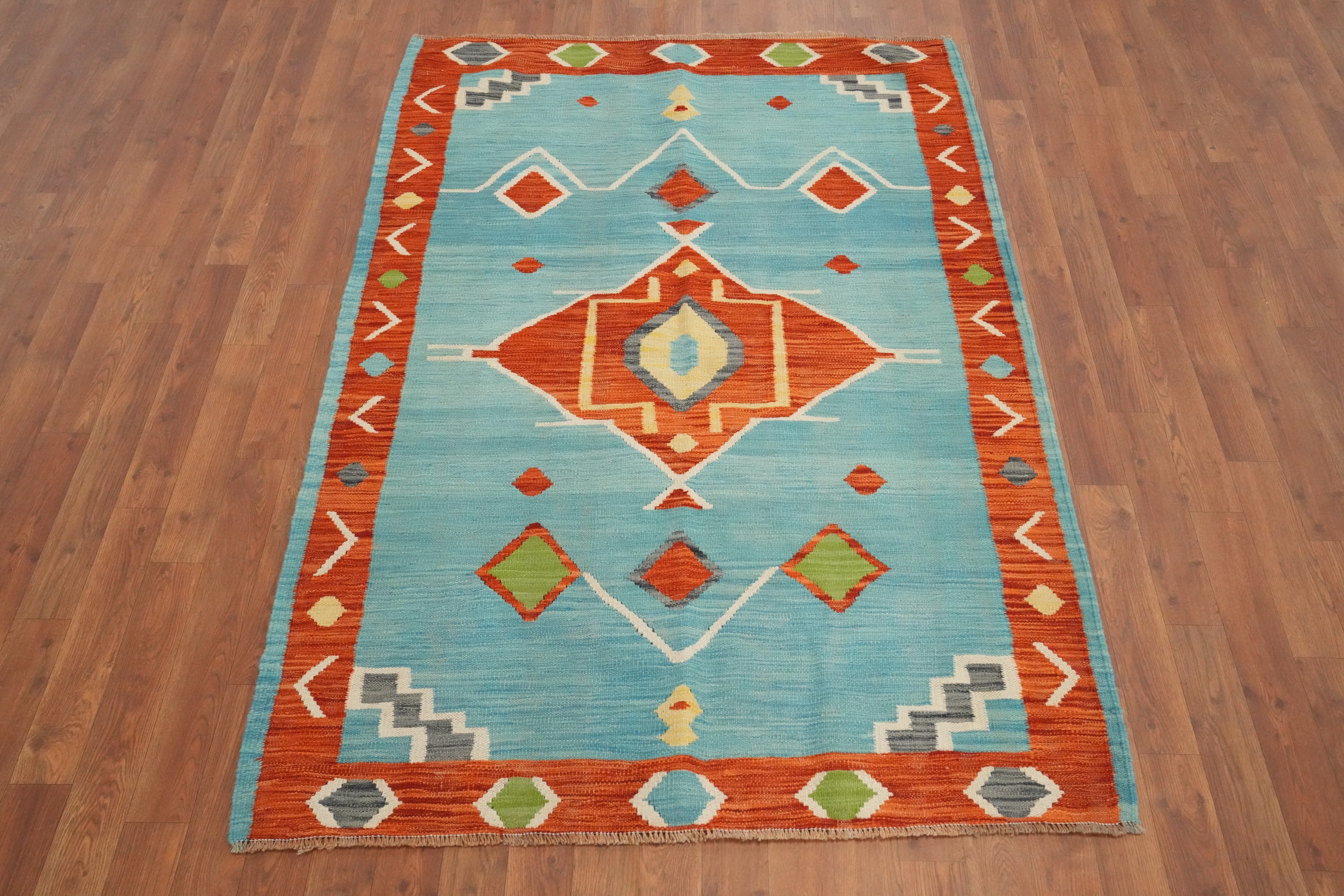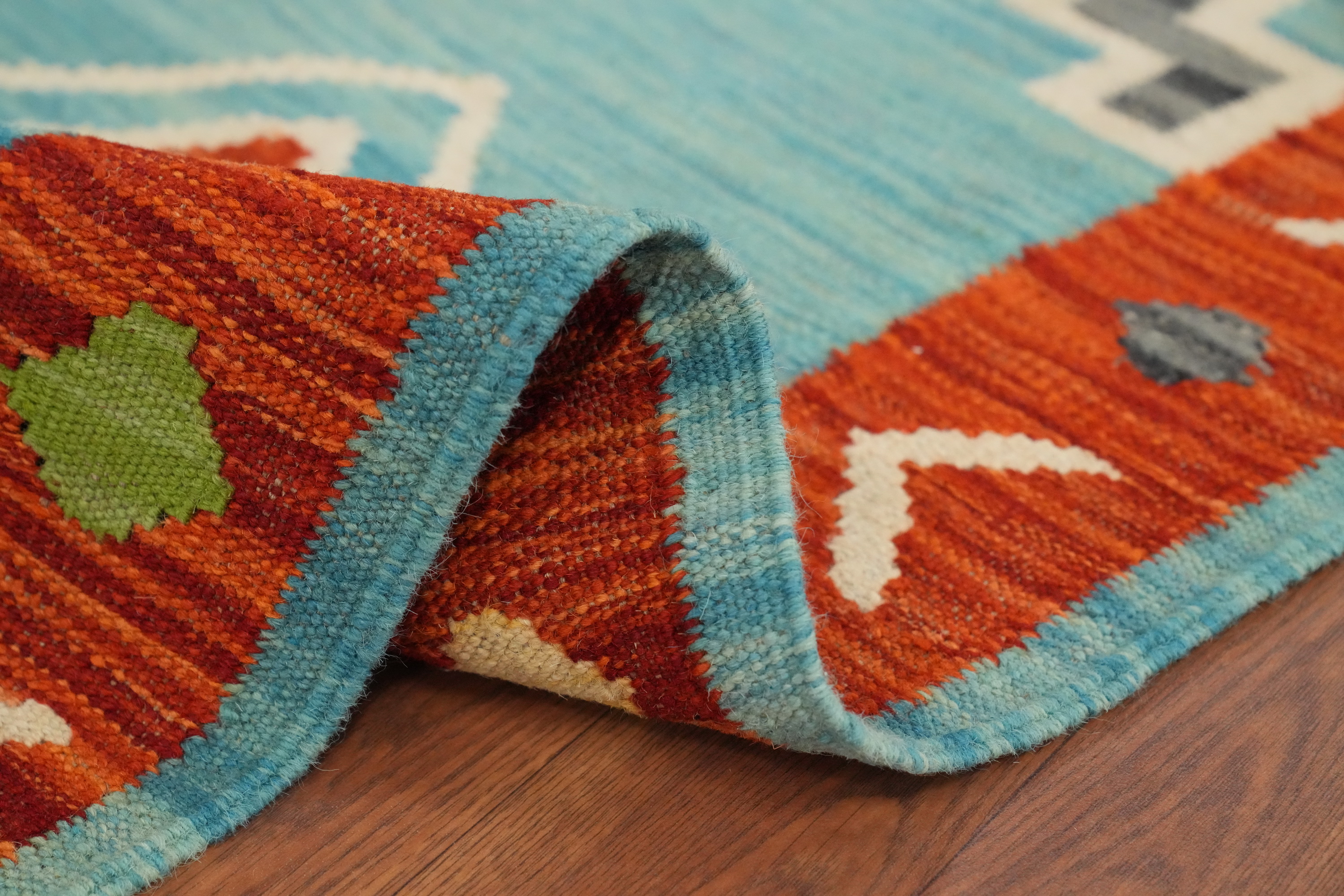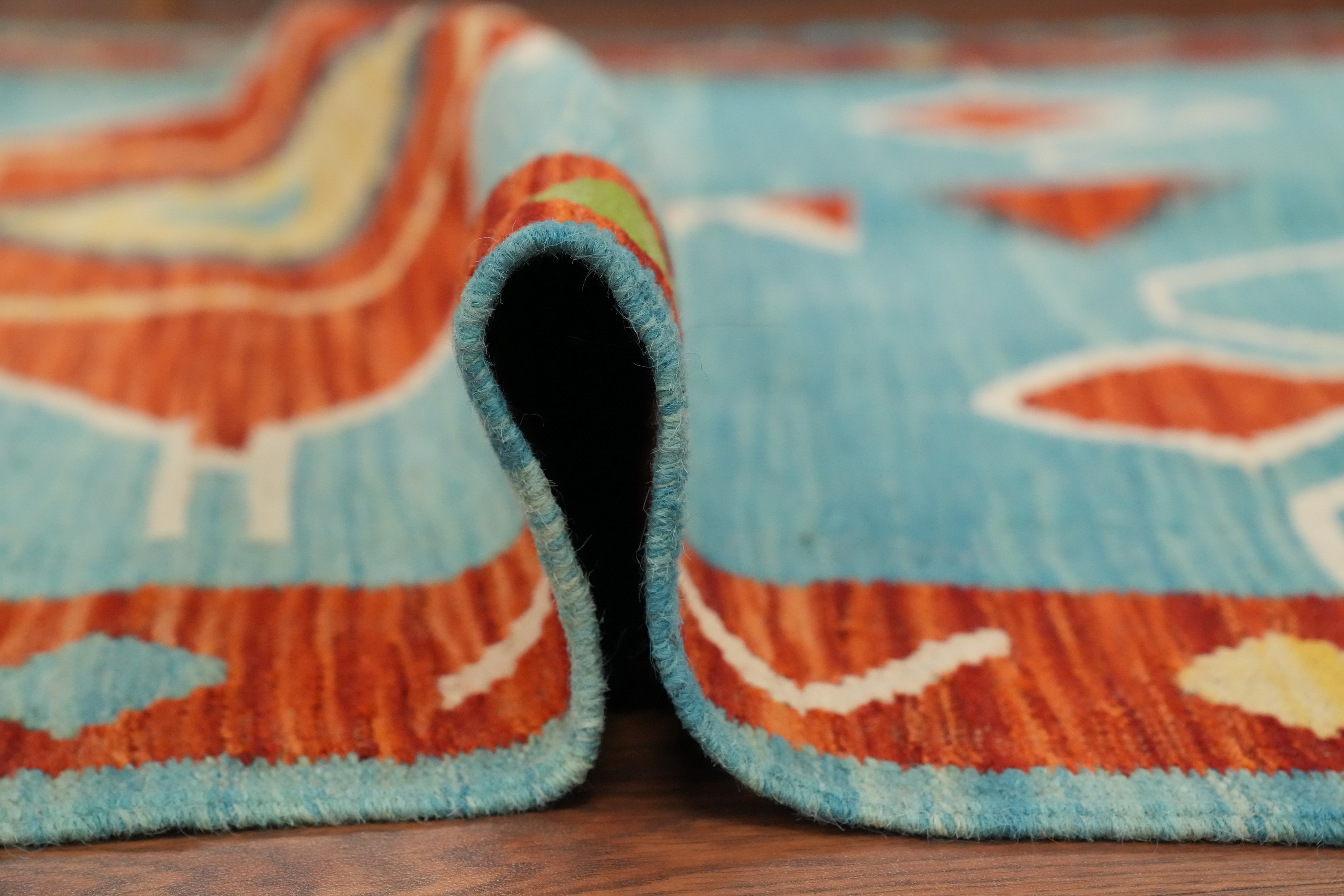 Blue/ Orange Kilim Handwoven Rug 4x6 Vegetable Dye Southwestern Geometric Carpet