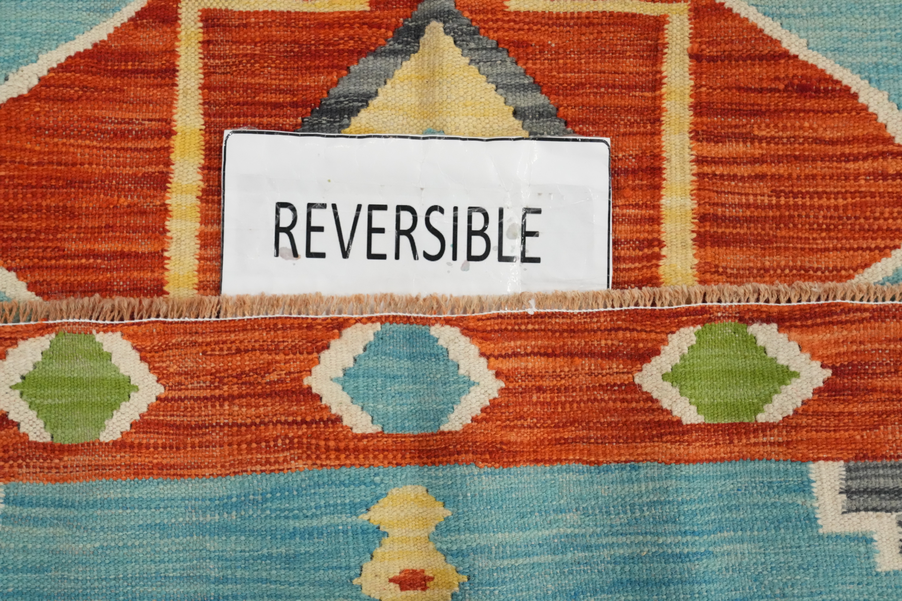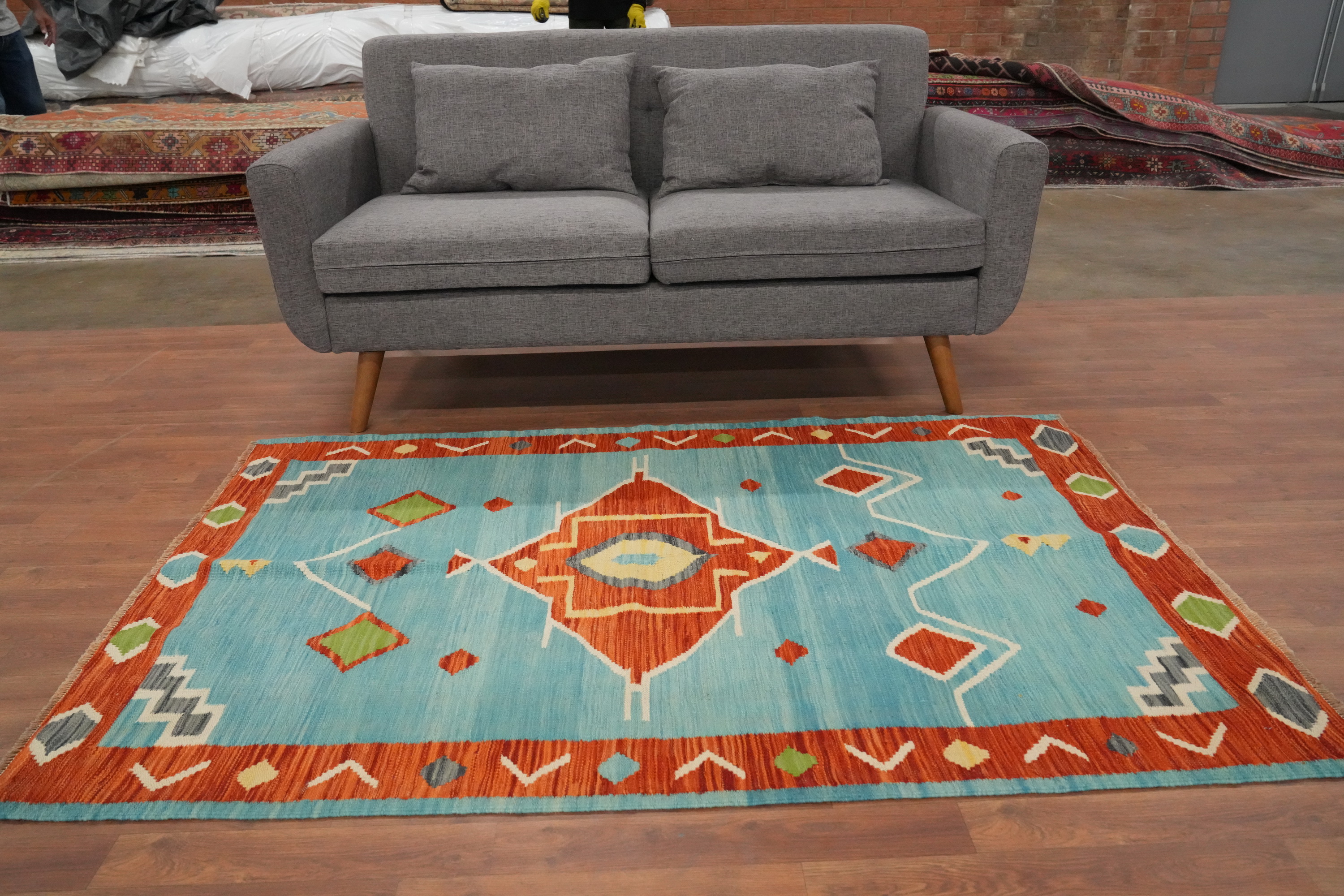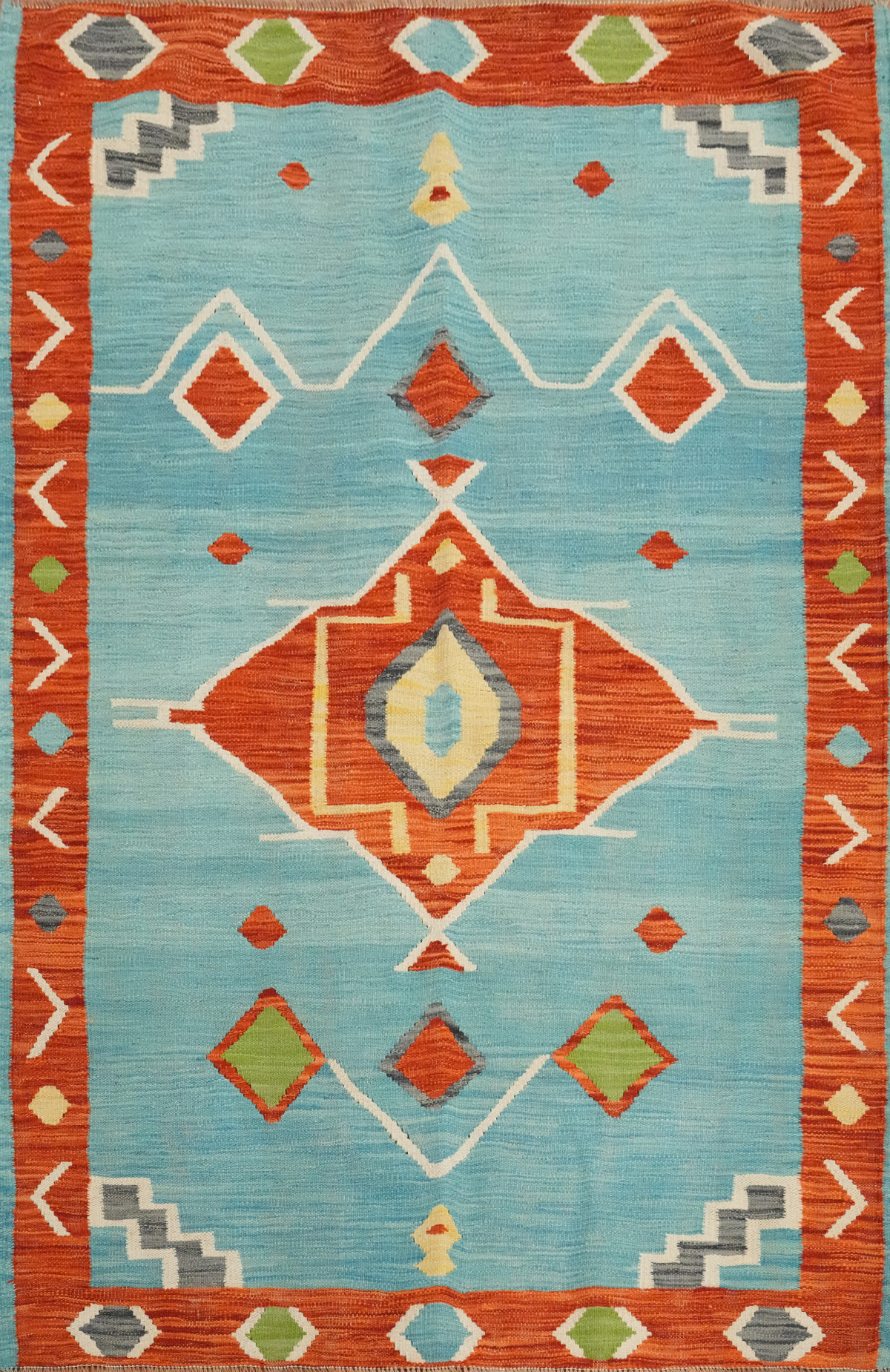 Blue/ Orange Kilim Handwoven Rug 4x6 Vegetable Dye Southwestern Geometric Carpet