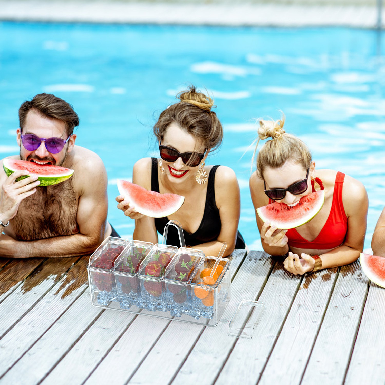 Keep Fresh:The Ice Chilled Condiment Caddy includes 5 food trays,5 tray lids and an ice tray. Simply put the fruits/condiments in the food tray,fill the bottom tray with ice and cover with the lids to keep food cold and fresh,perfect for indoor & outdoor parties.