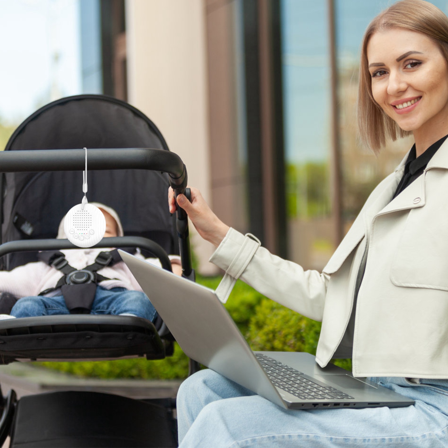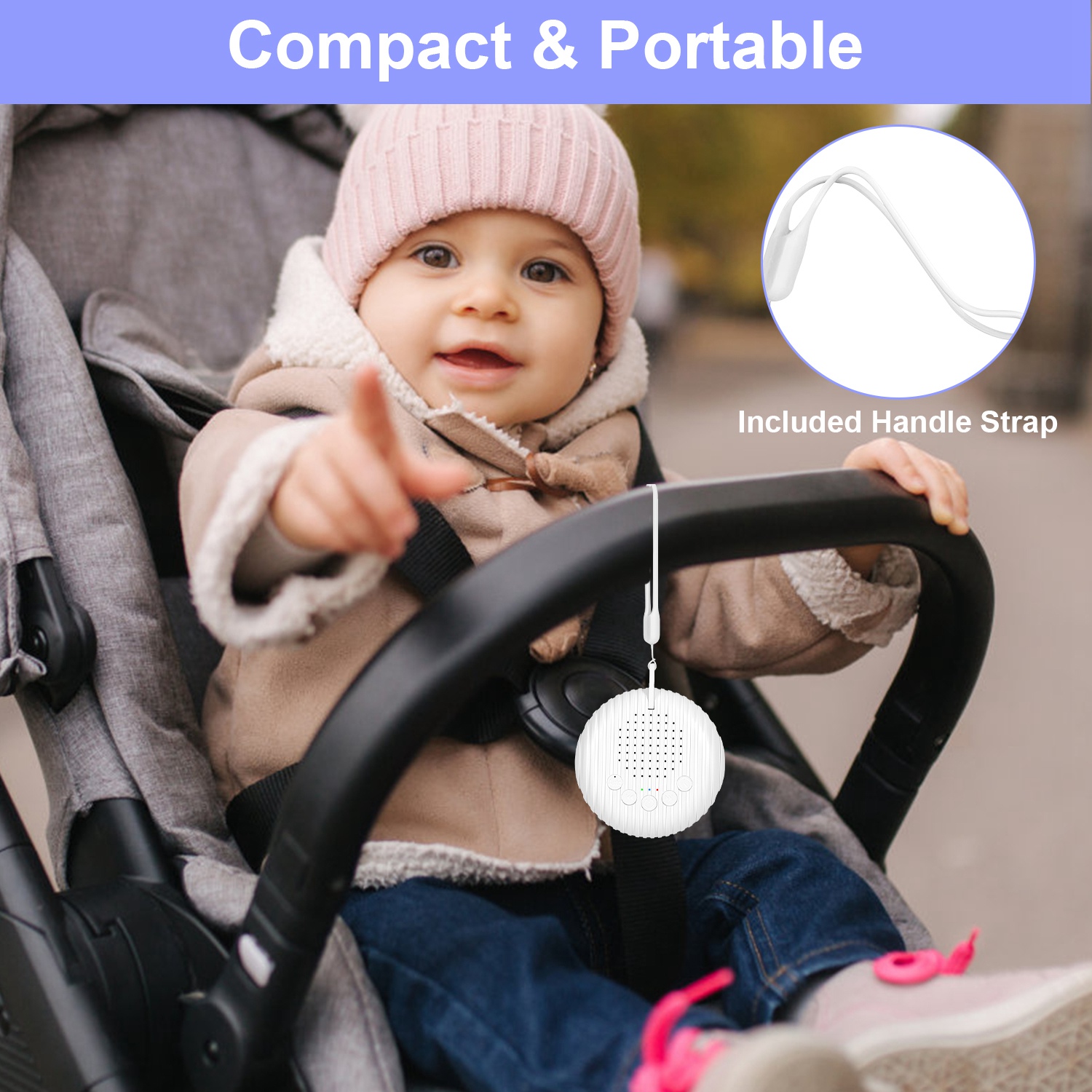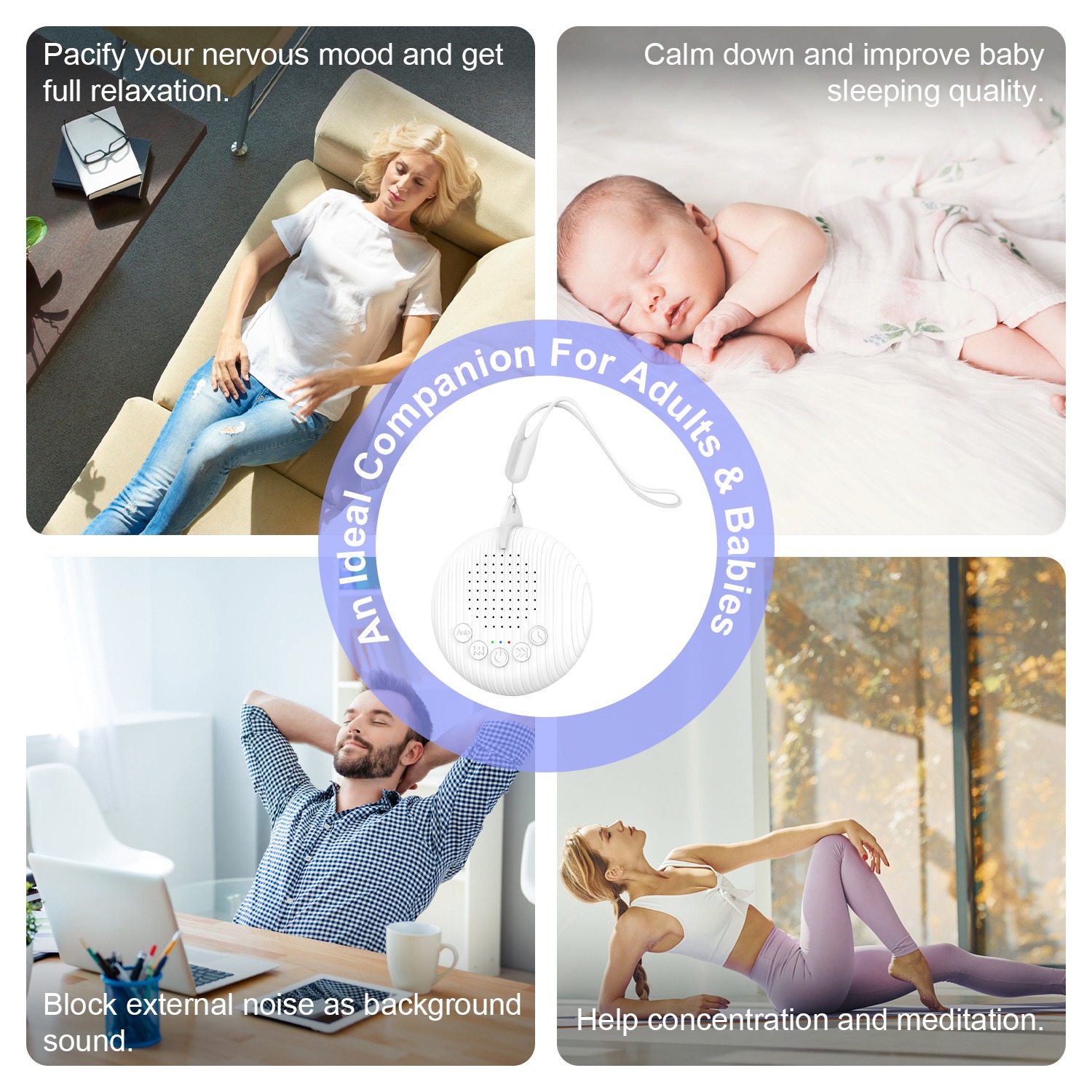 Compact & Portable White Noise Machine:Designed with angular-free appearance and silicone strap,our compact white noise machine is definitely safe for your baby and can be easily hung on cribs,strollers,diaper bags,car seats,and more,creating peaceful white noise to improve baby’s sleeping quality and adult relaxation. An ideal companion for working,home,travel or anywhere you .