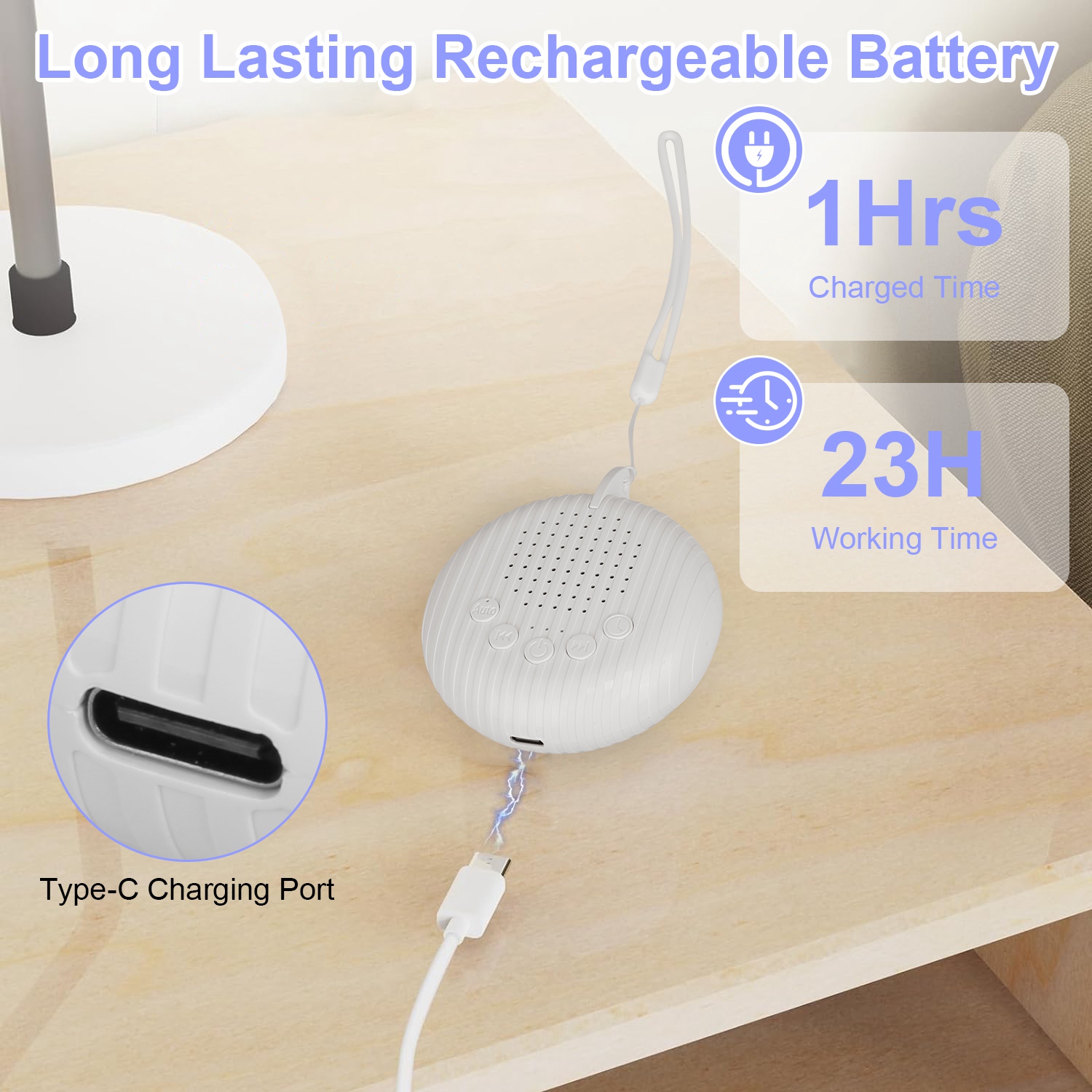 Long Lasting Battery:Powered by built-in 300mAh rechargeable battery,this compact but long lasting white noise machine supports up to 23hrs using after only 1 hours charged. Indicator light is convenient for you to observe the charging condition. An ideal companion for both babies and adults.