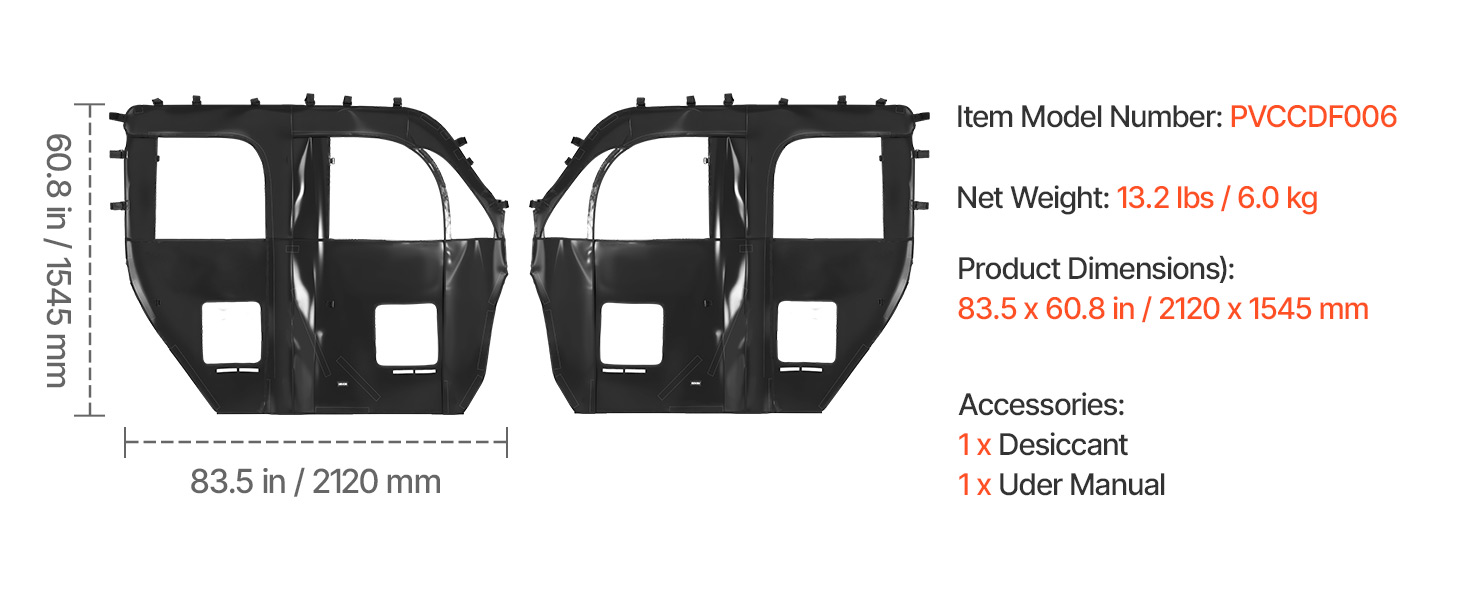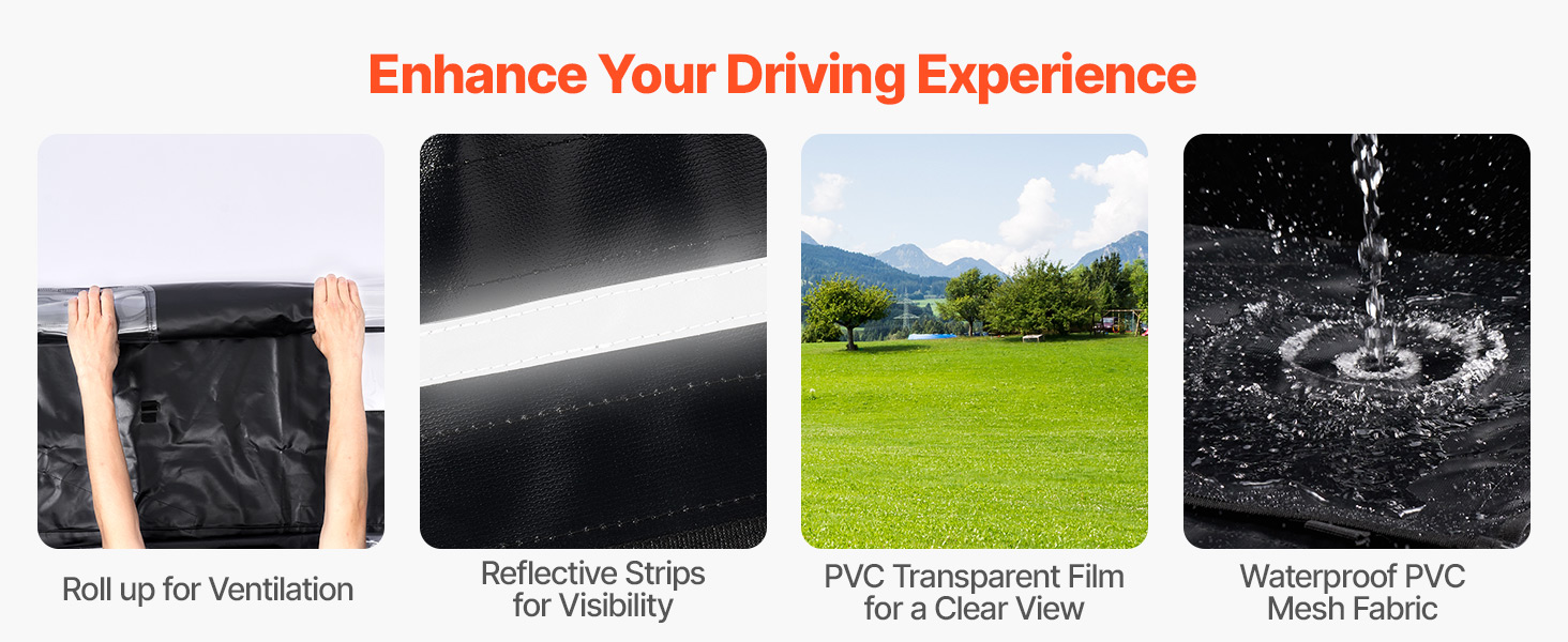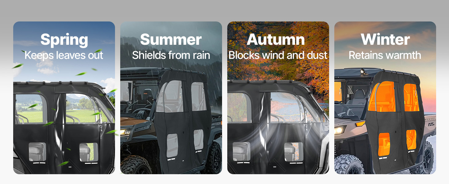 All-Weather Protection: Crafted from high-quality transparent PVC film and PVC mesh fabric, this UTV soft cab enclosure is waterproof, easy to clean, and resistant to yellowing. It shields you from dust and rain in summer, wind and snow in winter
