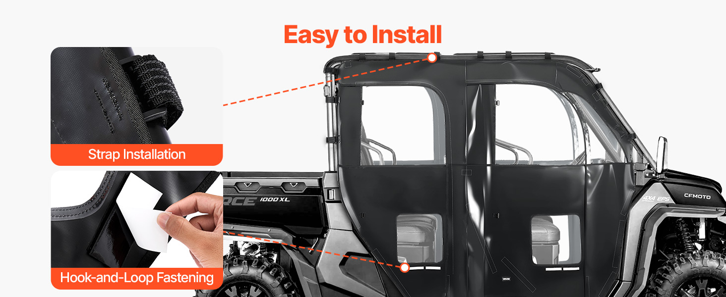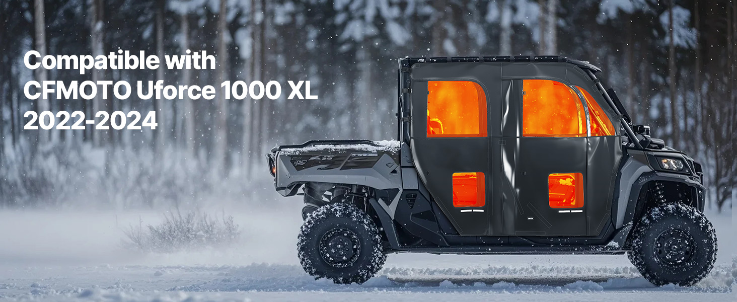 Vehicle Compatibility: These cab enclosure upper doors are compatible with CFMOTO Uforce 1000 XL 2022-2024. They install quickly with straps and hook-and-loop fasteners—no extra tools or drilling required for a snug, secure fit