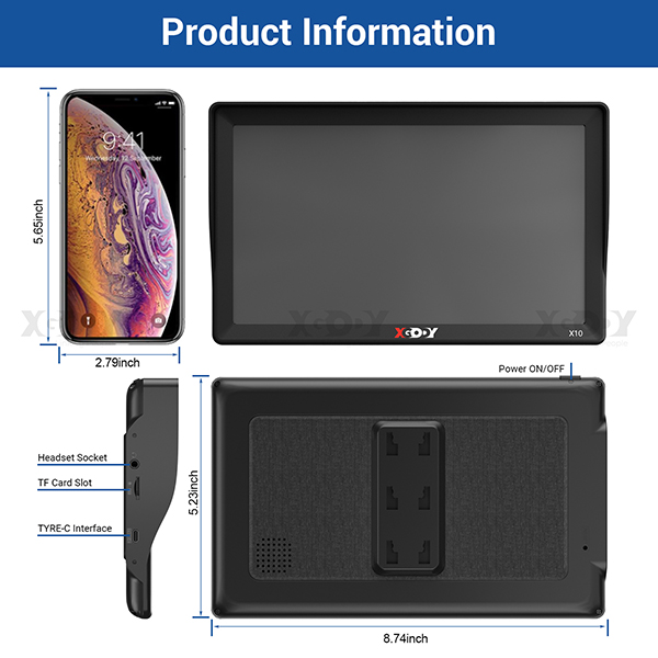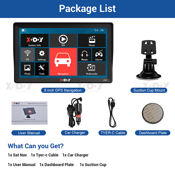 1* GPS NAVIGATION 1* Type-C USB Cable 1* Suction Cup Mount 1* Type-C Car Charge 1* Dashboard Plate 1* User Manual |