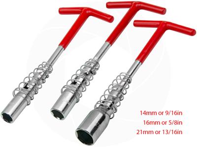 Set of three pieces individual spark plug sockets with T handle wrench spanners. This set includes three most common sizes of spark plug sockets, 14mm (9/16in), 16mm (5/8in) and 21mm (13/16in), that are currently used in the automotive industry. The tools are made of high quality chrome vanadium steel that provides high strength, hardness and wear resistance. Each socket is equipped with a built-in, high strength rubber ring to prevent damage to the inner wall of the spark plug. Double joint provides extra flexibility and the spring helps to for the head to return into the initial state.