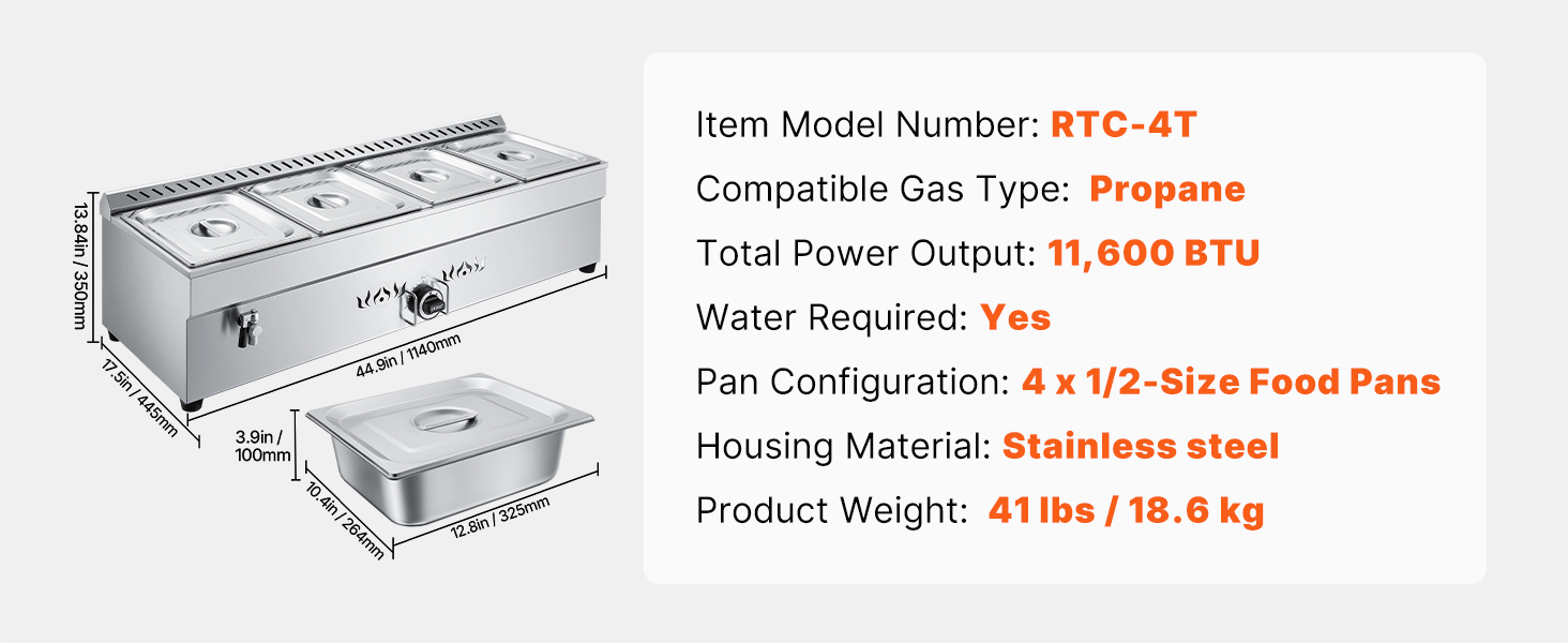 - Large Capacity: Measuring 44.9 x 17.5 x 13.8 inches, this propane food warmer includes 4 standard 1/2-size pans with lids to keep food warm. Supports easy replacement of pans up to 4" deep, providing flexibility for various dining needs and occasions