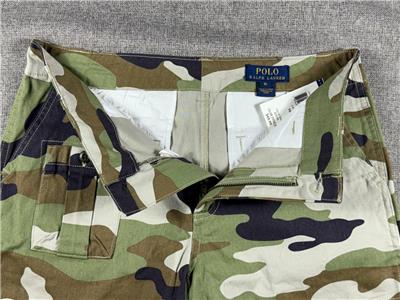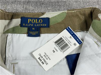 Up for grabs is a nice pair of cargo camo shorts from Ralph Lauren's POLO line in a Boys tag size 16...please be sure to use measurements provided to best determine fit as there are no returns. Multi-color woodland camo pattern. 100% cotton twill. With two front slash pockets and two rear welt pockets (each with flap and button closure), left side lower cargo pocket (with flap and button closure) and right side hip utility patch pocket with button closure. Button front closure with brass zipper fly and five belt loops. Measurements, laid flat, are as follows: