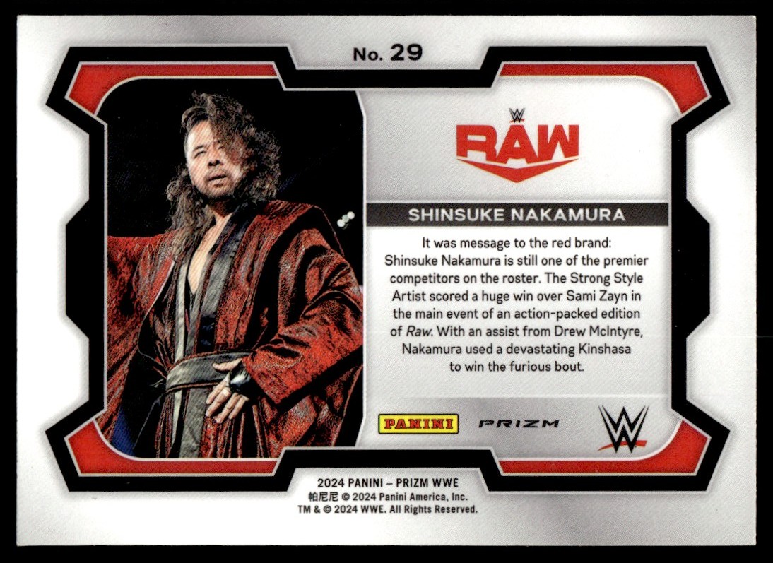 | Description: | Shinsuke Nakamura | | Category: | Wrestling | | Year: | 2024 | | Product: | Panini Prizm WWE | | Card Number: | 29 | | Special: | Red Wave | | Dimensions: | 3½" x 2½" | | SKU: | WR a0234 R148 D (14) |
