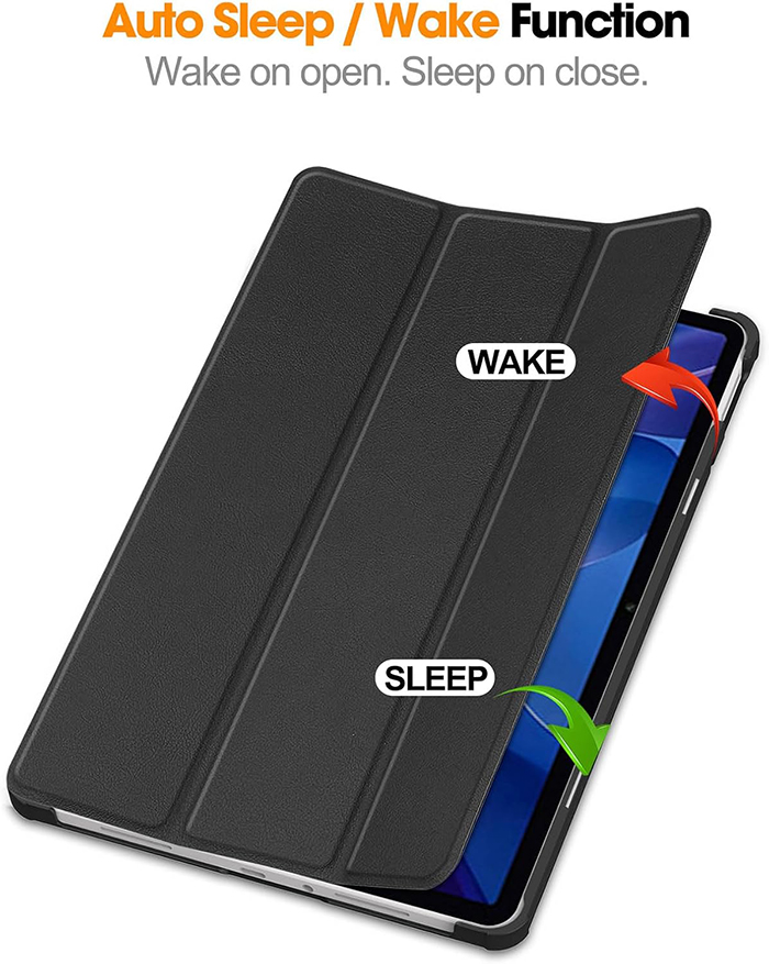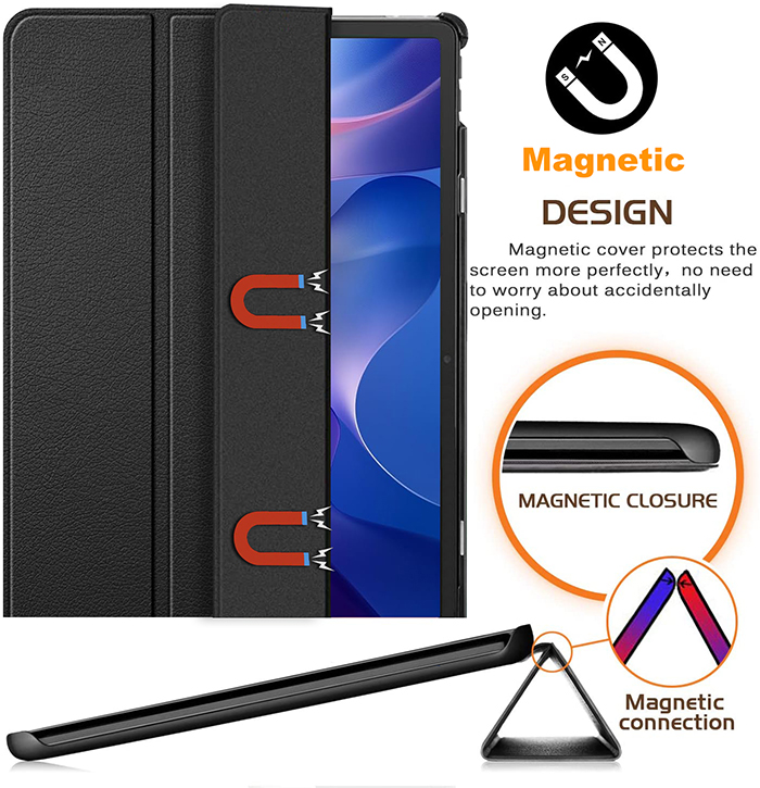 - Magnetischer Verschluss, mit der dreifach gefalteten Vorderabdeckung kann das Tablet als Ständer zum Ansehen von Videos oder als Tastaturständer genutzt werden.