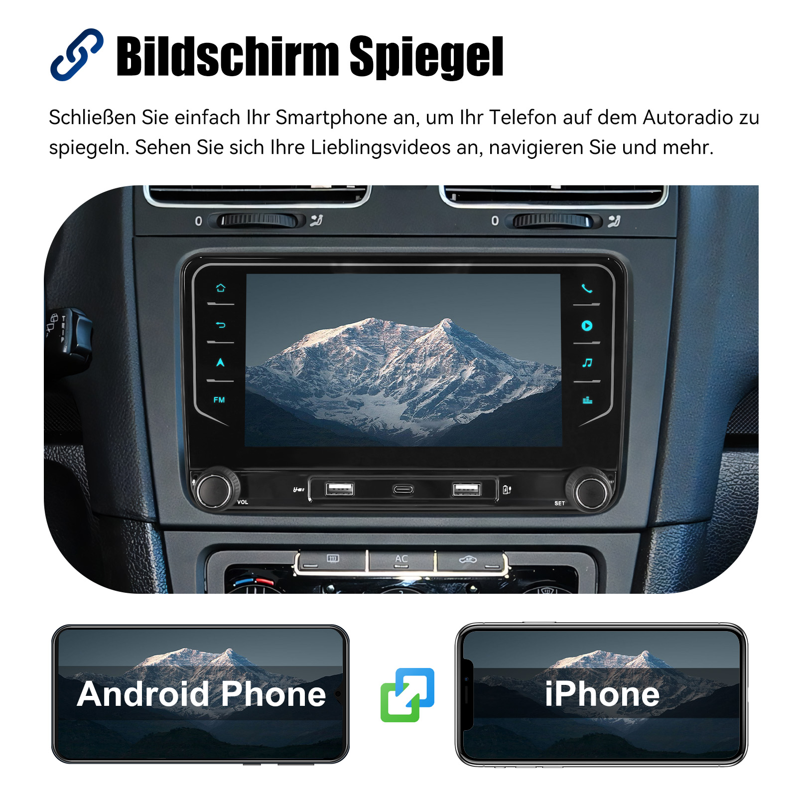 Bildschirm Spiegel für iOS/Android: Das Autoradio unterstützt Mirror Link für iOS/Android-Telefone. Nachdem Sie das Radio angeschlossen haben, können Sie die Telefonseite mit dem 7-Zoll-Touchscreen des Radios synchronisieren. Das iPhone stellt eine Verbindung über WLAN her, und das Android-Telefon stellt eine Verbindung über WLAN oder das Original-USB-Kabel her (gilt nicht für Samsung- und Huawei-Telefone).
