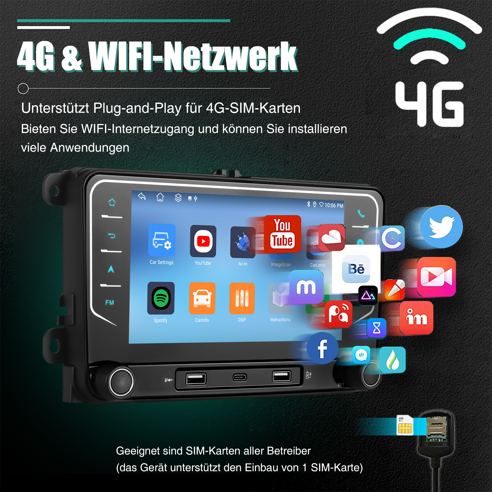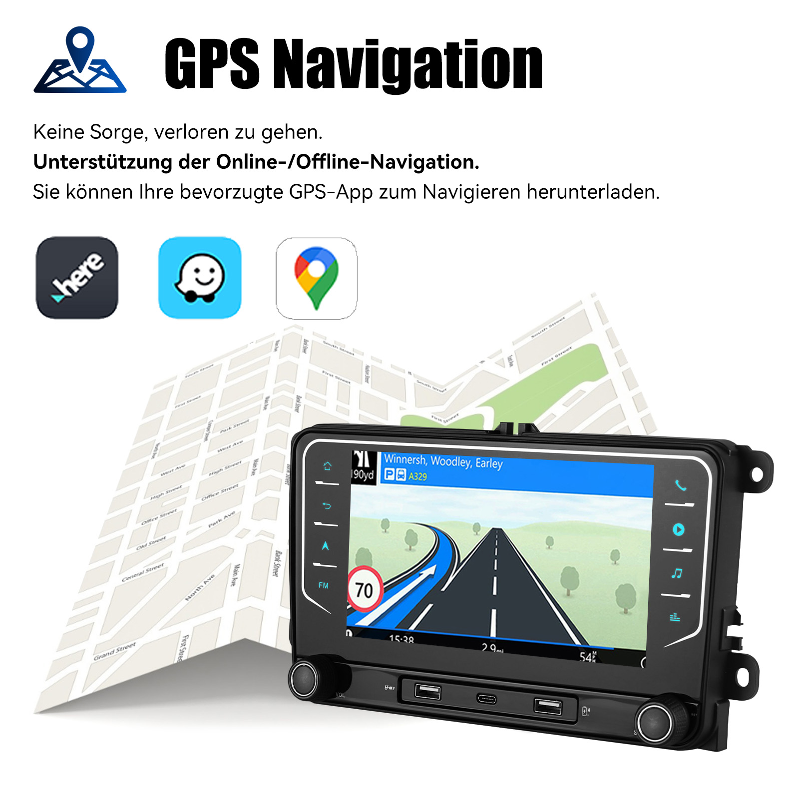 GPS Navigation 4G und WiFi: Sie können zwischen Offline- und Online-Navigation wählen! Mit vorinstallierten Offline-Karten können Sie nach dem Anschließen der GPS-Antenne in unserem Paket Koordinaten/Postleitzahlen/Adressen/POIs zur Routenplanung verwenden. Sie können Online-Navigations-Apps auch über WLAN und 4G-Netzwerke herunterladen. Außerdem können Sie andere Apps/Musik und Videos über WLAN und 4G-Netzwerke herunterladen!