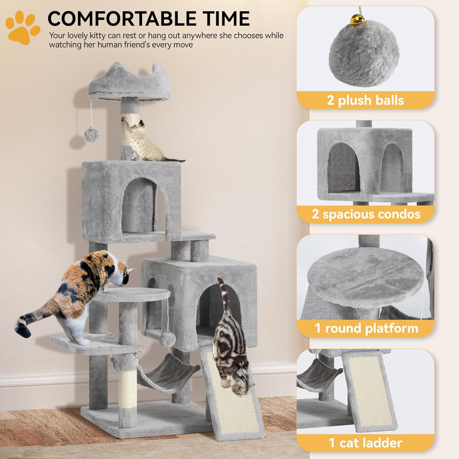 🐈Effortless assembly with clear instructions makes setup a breeze. Plus, with two dangling balls for endless play, our cat tower promises hours of entertainment.