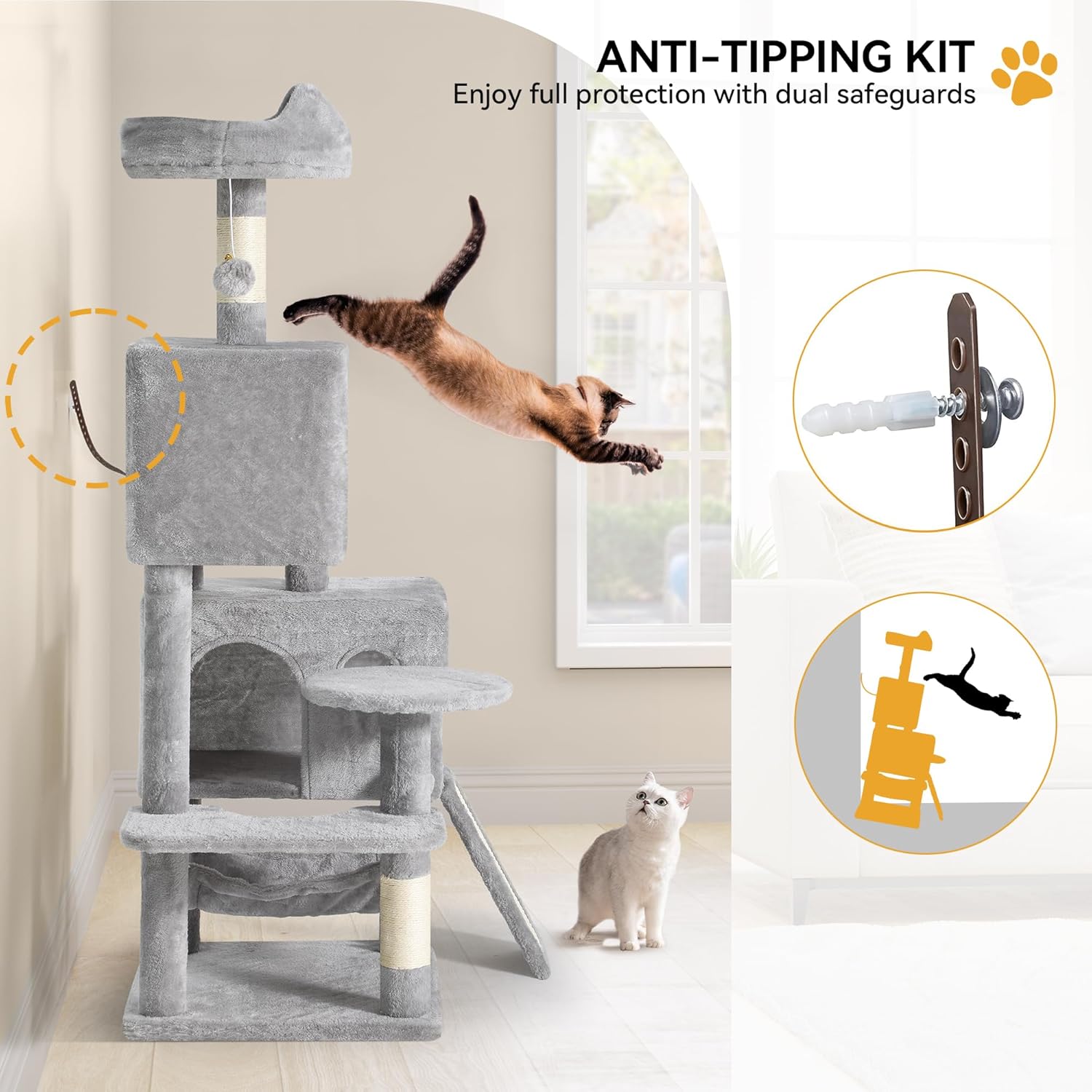 🐈Experience the epitome of feline luxury with our Secure & Durable cat tree. Boasting an anti-tipping mechanism and sturdy sisal stairs, it ensures safety for your beloved cat.