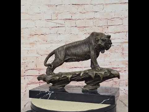 Embrace the untamed beauty of the wilderness with this stunning bronze sculpture titled ""Bugatti Tiger Wildlife."" Meticulously handcrafted by skilled artisans, this magnificent piece captures the essence of a powerful and majestic tiger in exquisite detail. The tiger's muscular form is expertly rendered, displaying its strength and grace as it prowls through its natural habitat. With a rich dark brown patina finish, the sculpture emanates a sense of depth and realism, further enhancing its lifelike appearance.Crafted using the ancient lost wax method, this solid bronze sculpture is a testament to the artist's skill and dedication. Each intricate feature, from the tiger's expressive eyes to its intricate stripes, is meticulously sculpted to perfection. The sculpture is mounted on a rectangular black marble base, adding a touch of elegance and stability. As a true masterpiece of wildlife art, this sculpture is signed by the renowned artist Bugatti, ensuring its authenticity and value.Bring the untamed spirit of the tiger into your home or collection with this exceptional bronze sculpture. Whether displayed on a mantel, shelf, or desk, it will captivate viewers with its lifelike presence and artistic craftsmanship. Perfect for wildlife enthusiasts and art collectors alike, this Bugatti Tiger Wildlife sculpture is a testament to the timeless allure of nature's most magnificent creatures.