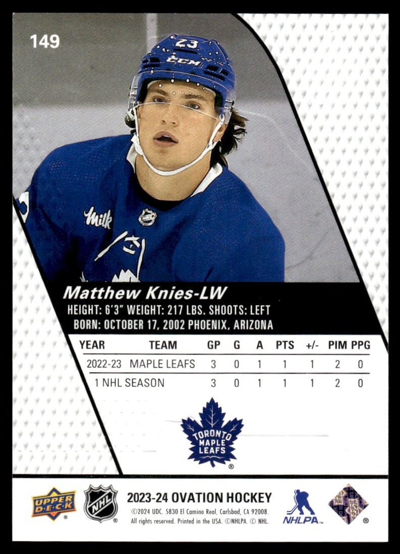 | Matthew Knies Rookie #149 2023-24 Upper Deck Ovation Toronto Maple Leafs |